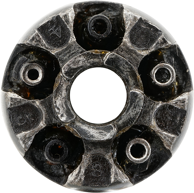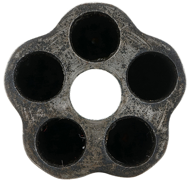 銃本体のシリアルが No.438でフレーム(左側グリップの下)、シリンダー(後部)、サイドプレート(内側)、トリガー・ガード(内側)、バレル・ウェッジ(下側)、銃身(下部)などのシリアル No.が全てマッチしています。 コルト型のリボルバーの宿命であるシリンダーのガタもない完全品です。 フレームの唐草模様のエングレービィングも完全に残っており、オリジナル・ブルーも残った元々の程度が良かった品であることが判ります。 銃身内にはライフリングがハッキリと残っており、最後まで抜けています。