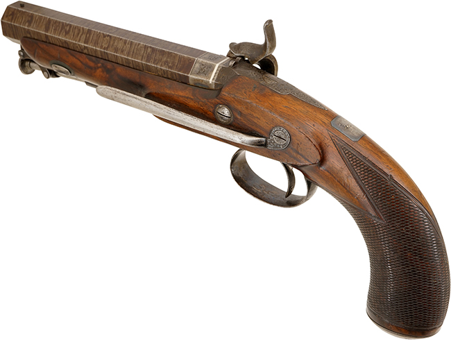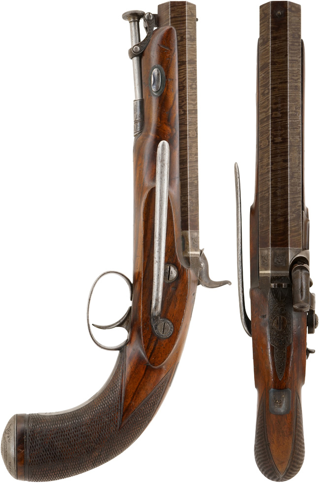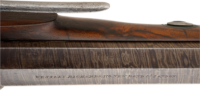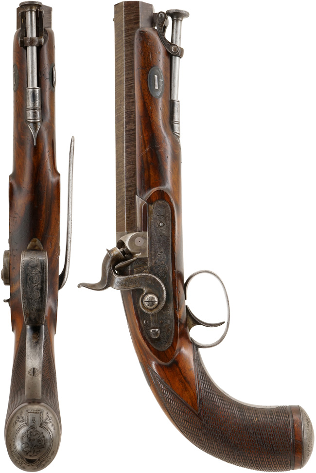 ウェストリー・リチャーズ社 の記録には本品と同じモデル(Westley Richards 16g Holster Pistol)が1839年にロンドンの170 New Bond St. 本社から同社の米国代理店Westley Richards’ U.S. Agencyに発送された事が残っています。その品は“very high standard"と呼ばれる高級モデルと呼ばれ“サイド・ロック、ハンマー、トリガー・ガード、ブリーチ・ブロックは伝統的なアカンサス・クロール エングレービング(acanthus scroll engraving)が施され、サイド・ロックにはフラット・フェイス・サーペンタイン・ハンマー(flat faced serpentine hammer )はドルフィン・ヘッド(dolphin head )の形をしています。その後ろにはバック・スライド・セーフティが備えてあります。また“Westley Richards"とメーカー名も入っています。銃身は8" ツイスト・ダマスカス・オクタゴン・バレルで上部に“171 NEW BOND ST LONDON WESTLEY RICHARDS"のメーカー名と住所が入っています。 銃身にはVノッチのリア・サイトに真鍮製のビーズタイプのフロント・サイトが付いています。 木部はEuropean walnut 製で、グリップは“bag shaped"と呼ばれる丸みを帯びた形状になっています。フォアエンドと呼ばれる先台は銃口の近く(◯cm後方)まで伸びています。 グリップにはフラット・トップと呼ばれる緻密なチェッカーリングが施されています。グリップの背には長方形の家紋用のプレートが付いています。 この説明はまさしく本品の解説としてそのまま使えます。