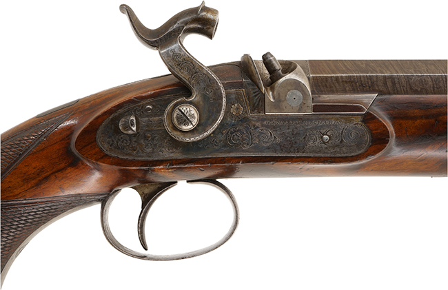 本品の程度は木部の状態も良く、極僅かな小さな打ち傷はありますが全く気になりません。 木部には仕上げもオリジナル艶が完全に残っています。金属部は銃身はハッキリとダマスカス模様が出ており、古い白磨き仕上げの部分は美しく輝いています。 サイド・ロック・プレート、ハンマー、トリガー・ガード、バレル・タングの上品な唐草模様の装飾も完全に残っています。ネジの殆どにも装飾が入っています。 ハンマーをコックにして、バレル・タング上のネジとサイド・プレートを留めているネジの2本を外し、ストック前部側面の楔(クサビ)を右から左に抜くことによって、銃身が簡単に外れます。 スイベル・ラム・ロッドと呼ばれる、紛失防止機能の付いた鉄製の「振子型」さく杖が付いています。 これは英国製のパーカション・ピストルの多く見られる特徴です。 銃口から火門(ニップル)まで通っている事を確認済みです。 ハーフコック、フルコック共に非常に歯切れ良く掛かる作動の完全な品です。