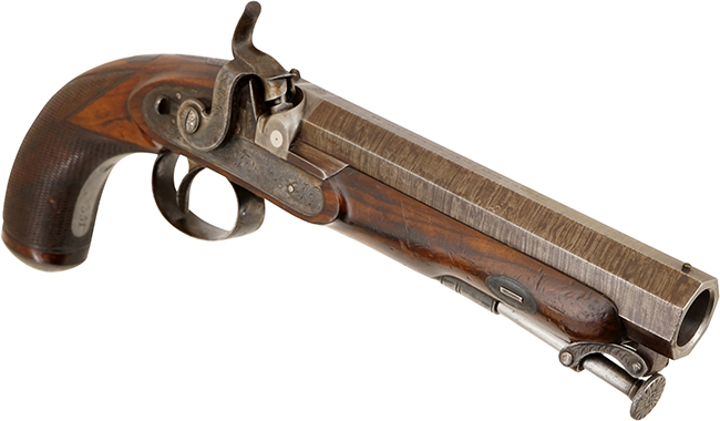 1840年頃にイギリスのウェストリー・リチャーズ社で製造されたベルト.ピストルと呼ばれる中型サイズのパーカッション式(管打ち式)のシングル ・ショット ピストル(単発拳銃)です。 口径17mm、重厚な外形◯◯mmもあるオクタゴン(八角形)のダマスカス・バレルでライフリングの入っていない滑腔銃身になっています。本品はハンマーがサイド・ロック・プレートの最も後ろに位置する1850年以前の典型的な英国製に多く見られるタイプです。 フリント・ロックからパーカッション・ロックへの移行期(1800年前期)にはサイド・ロック・プレートは当り金があった名残りからハンマーがサイド・ロック・プレートの比較的後方にありました。