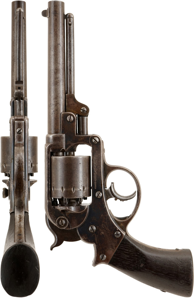 一体型に見えるフレームは、シリンダー後方のサム・スクリューを外すとロックが外れ、銃身が前に倒れます。 この中折れ方式を英語では「トップ・ブレイク」と呼びます。 金属薬莢を用いるトップ・ブレイクは、中折れした際に空薬莢を排莢するのですが、本銃は管打ち式為にその必要はありません。 本銃の場合は中折れしたと同時にシリンダーが外れる仕組みになっています。 他の管打ち式回転拳銃と同様に装填した予備シリンダーと交換する事によって、素早く射撃を再開できるようになっています。 もちろん予備のシリンダーが無くても、本体からシリンダーを外した方がより効率的に装填する事が出来ます。 サム・スクリューを外して、シリンダーを抜く方法はレミントンに比べ、手間のかかるものだったのが、この銃がポピュラーにならなかった一因と言えるでしょう。 管打ち式のダブル・アクションと言うだけで時代的に珍しいだけではなく、この特殊なシングル/ダブルの切り替え構造やトップ・ブレイク方式はメカニズム好きには大きな魅力となるでしょう。 この複雑なメカニズムのために多くの小さな部品はしている古式銃にも拘わらず、本品は非常に良い状態で残っています。 コレクションとして所持する楽しみに加え、メカニズムを堪能できる他の銃にはあまりない魅力があります。