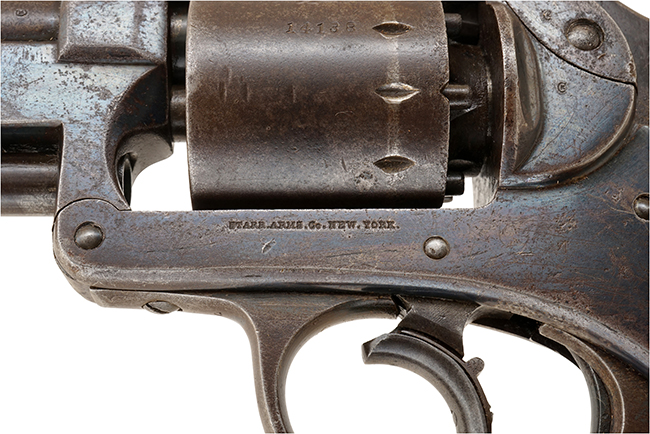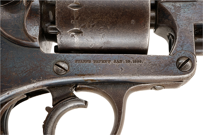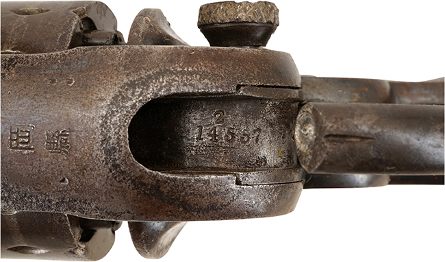 フレームの半分ほどにオリジナルのブルー仕上げが残っている、再仕上など後世の手が加えられていないオリジナル度の高い品です。 暗めの色合いの木製グリップの状態も良く、が入っています。 本品の作動は良好でダブル・アクションのトリガーを引くとハンマーを起きてシリンダーが歯切れ良く回転します。 オリジナルのメイン・スプリングの為、トリガーが非常に重たいです。 シングル・アクション用の小型のトリガーも正常に作動します。 多少その作動に違和感を感じるかも知れませんが、本モデルはダブル・アクションをメインとしていますので、この作動自体は正常なものです。 フレーム左側面下に「STARR.ARMS.CO.NEW.YORK.」とスタール・アームズ社の刻印が、フレームの反対側(右側)にはSTARRS PATENT JAN. 15, 1856のパテントの刻印が入っています。 米国陸軍のインスペクター花押とも呼べる、イニシャルが入った刻印 (Cartouche=カートゥーシュ) が打刻されているのが確認出来る事から、本品が米国陸軍に納入された内の1挺である事が判ります。Cartoucheのイニシャルは長方形の中に筆記体で「G.K.C.」と入っており、検査官は南北戦争中(1861-63年)にSpringfield Armoryで検査官をしていました。 シリンダーの刻印はNo.14138でフレーム(ハンマーを起こした時に見える、ハンマーの付け根)のシリアルはNo.14537で残念ながらマッチしていません。