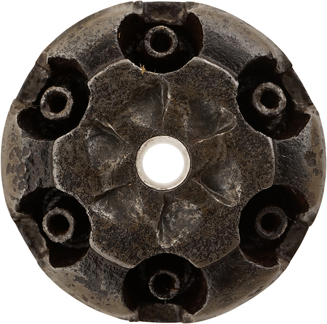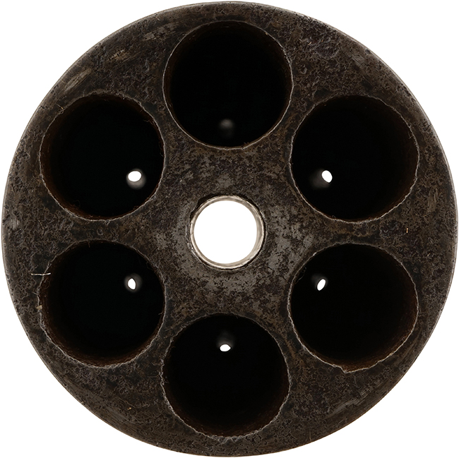 作動については完全で、ハンマーのハーフ/フル・コックはしっかりと掛かり、シリンダーも正常に回転します。 フル・コック位置でトリガーを引くと、ハンマーがスムーズに落ちます。 銃身内は銃口から銃身後部まで完全に抜けて (通って) おり、若干の表面錆は見られるものの、ライフリングは比較的はっきりと確認出来ます。 ローディング・レバーを下げてシリンダー軸を前方に引き抜くと、シリンダーを容易に取り外す事が可能です。 ローディング・レバーは左右にやや遊びが見られるものの、機能については問題なく、前方に折り畳んだ際のキャッチもしっかりと掛かります。 シリンダーのパーカッション・ニップルについては、やや時代錆や若干の変形が見られるものの、目立った欠損等は見られず、概ねしっかりとした状態が保たれています。