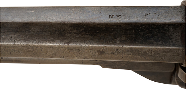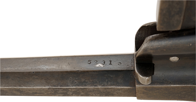 本品のグリップ・パネルを取り外したグリップ・フレーム左側面及び銃身下面にはマッチしたシリアルNo.5231が入っている他、トリガー・ガードの後端差込部にも5231のマッチしたシリアルNo.が確認出来ます。 本品のシリアルNo.はタイプ IIIのシリアルNo.レンジに収まっていますが、ハンマー・スパーの滑り止めチェッカリングについては、タイプ II以前の手作業で彫られたダイヤモンド・パターンとなっており、ハンマーは生産過程でタイプ Iもしくはタイプ IIの余剰部品を流用したと考えられます。 本品の銃身上面のビールスのパテント刻印は現状確認出来ず、レミントン社のメーカー刻印についても、「N.Y.」部分を残してそれ以外は確認出来なくなっています。