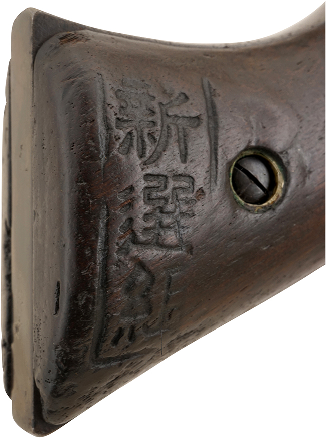 本品の銃身やフレーム、シリンダーといった鉄部は、全体に仕上げ直しによるブルー仕上げが施され、やや打ち傷や経年による褪色の他、若干の表面錆痕や一部朽ち込み痕が見られるものの、目立った欠損等は見られず、概ねしっかりとした状態が保たれています。 真鍮製のトリガー・ガードはやや磨かれており、若干の打ち傷は見られるものの、現状目立った腐食や変形等は見られません。 木製のグリップについては、角の部分にやや痩せや若干の欠けが見られる他、右側グリップ・パネル下部にひびの補修痕が見られるものの、取り付け自体はがたつきもなくしっかりとしています。 尚、左側グリップ・パネルには「新選組」の焼印が大きく入っています。