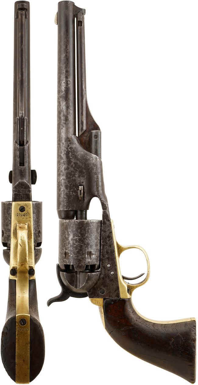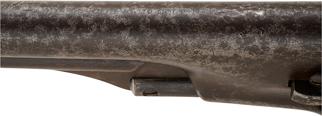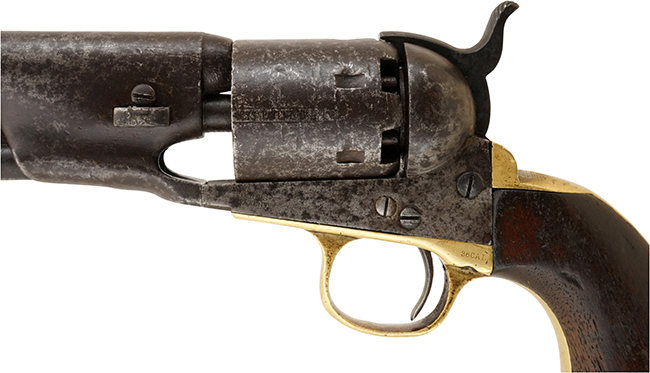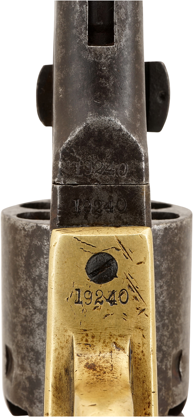 本品のシリアルNo.は19240で、シリアルNo.から1864年 (文久3年-元治元年) に製造された品である事が判ります。 シリンダーはラウンド・シリンダーとなっており、トリガー・ガード及びバック・ストラップは真鍮製、フレームはストック用の切り欠きのないスタンダードなタイプとなっています。 銃身上面には一部薄くなって判読が難しいものの、「- ADDRESS COL. SAML COLT NEW-YORK U.S. AMERICA -」のメーカー・アドレス刻印が一行で入っています。 本品のシリアルNo.は、銃身、フレーム、トリガー・ガード、バック・ストラップ、シリンダー、シリンダー軸、バレル・ウェッジが(19)240でマッチしています。 シリンダー表面のカンペチェ海戦 (Naval Battle of Campeche) の場面のロール・エングレービングについては、全体に薄くなり、ほぼ確認出来なくなっています。 シリンダーのパテント刻印についても一部薄くなり見え難くなっていますが、シリアルNo.刻印については比較的はっきりと確認出来ます。 フレーム左側面の「COLTS PATENT」の刻印やトリガー・ガード基部左側面の「36 CAL」の刻印については、比較的はっきりと残っています。