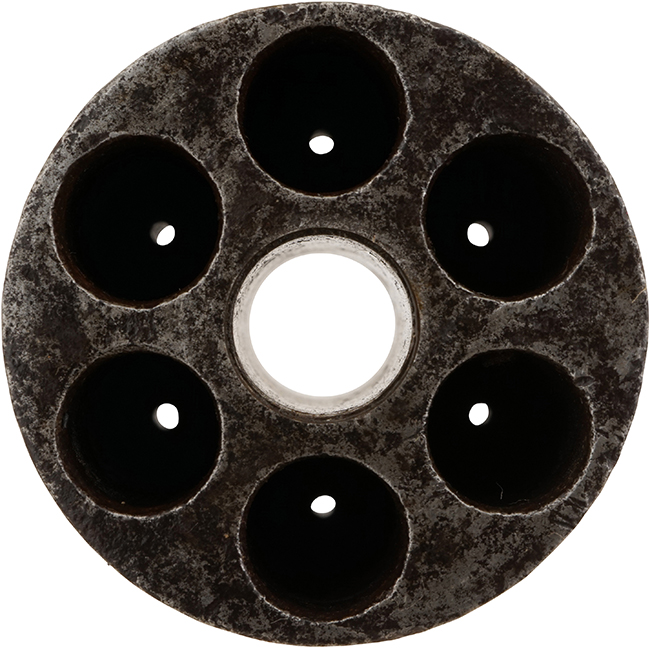 作動については完全で、ハンマーのハーフ/フル・コックはしっかりと掛かり、シリンダーも正常に回転します。 フル・コック位置でトリガーを引くと、ハンマーがスムーズに落ちます。 コルト系リボルバーの持病とも言える、銃身とフレームの取り付けのがたつきについては、現状殆ど見られません。 また、シリンダーの前後の遊びについても十分許容レベルです。 ローディング・レバーは左右にやや遊びが見られるものの、機能については問題なく、前方に折り畳んだ際のキャッチもしっかりと掛かります。 シリンダーのパーカッション・ニップルはやや時代錆が見受けられ、一部僅かな変形が見られるものの、大きな欠けは見られず、概ねしっかりとした状態が保たれています。