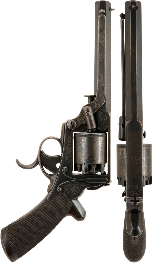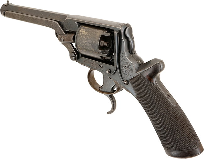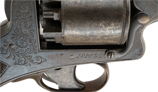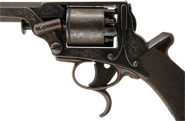 本品は全体的にブルーが残った上にタッチ・アップで仕上げをした見た目の良い品です。 作動に関しては、セカンド・トリガーを引いてからファースト・トリガーを引いてハンマーを作動させるシングル・アクション作動及び、セカンド・トリガーとファースト・トリガーを同時に引いてハンマーを作動させるセルフ・コッキング作動のいずれもしっかりと作動します。 銃身後部の一部、フレーム、トリガー・ガード、エンド・キャップに緻密な英国風の唐草模様が入っています。 銃身先端のクラウンが綺麗で.44口径相当の銃口は迫力があります。 また銃口近くには英国製リボルバーの特徴でもある飾り彫刻が入っています。 タッチアップはされていますが、全体的な程度は古式銃としては良い物で作動的にもとてもしっかりとしたお勧めの品です。 緻密なチェッカー・リングが入ったグリップも僅かな使用感があるだけで完全です。