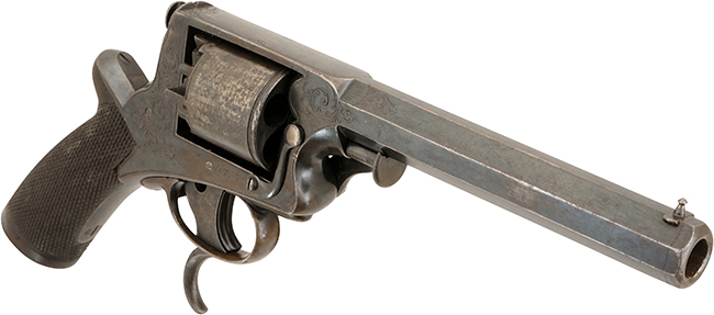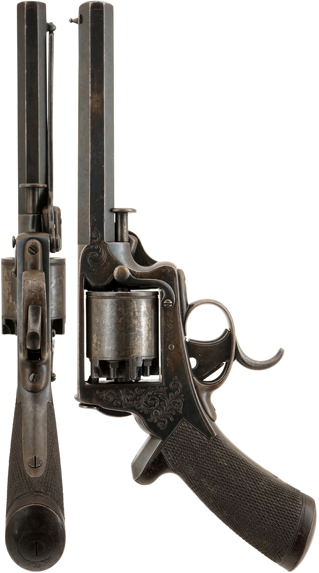 英国陸軍で採用された 54 Bore (.442 calibre=.44口径相当)の大型リボルバーで、銃身とフレームが一体となった頑丈で非常に見栄えのする品です。 (本個体は軍用で採用された刻印は入っていません) トランター リボルバーのダブル・トリガー・モデルは、現在のような一本の引き金を強く引いてハンマーを操作するダブル・アクション作動や、ハンマーを親指で起こしてコックした後に引き金を軽く引いてシングル・アクションで作動する、現在では当たり前のような構造が登場する前の過渡期のダブル・アクション・リボルバーです。 トリガー・ガードの下から飛び出したセカンド・トリガーと呼ばれる指かけを引く事でシリンダーが回転し、ハンマーをコックされます。 この状態で、セカンド・トリガーを引き続けたまま、本来の位置にあるトリガー(セカンド・トリガーに対して、ファースト・トリガーと呼ばれます)を引いてシングル・アクション・リボルバーの様にハンマーをリリースします。 これはウィリアム・トランター(Wiliam Tranter)が1853年1月28日に英国パテント第212号を取ったものを製品化した品でダブル・トリガー・モデルと呼ばれており、その特徴的な作動は「ヘジテート・アクション」とも呼ばれます。 その後ボーモントのダブル・アクションを機能を取り入れた品もトランターで作られましたが、それらはシングル・トリガー・モデルと呼ばれ大きく区別されています。 現在国内に入っているトランターの多くが「シングル・トリガー・モデル」で「ダブル・トリガー・モデル」は珍しいです。