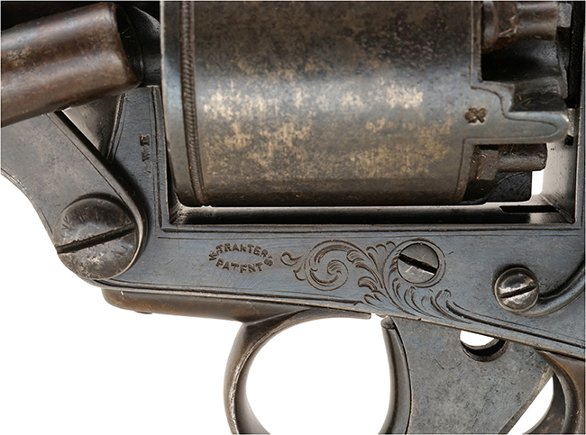 本品の最も大きな特徴であるトランター ダブル・トリガーの左側面に「TRANTER PATENT」の刻印が入っています。 フレーム右下方にシリアル No.18143Tが入っており、その最後の「T」はTranter社製であること表しています。また本体左下側面とローディング・レバーにも「TRANTER PATENT」の刻印が入っています。(MM)