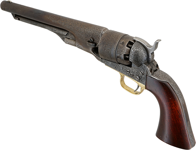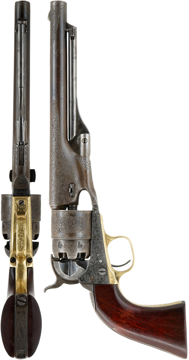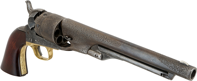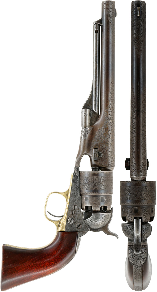 蛇足になりますが、M1860 アーミー リボルバーの呼称は、20世紀になってからコレクターが便宜上付けたもので、発売当時のコルト社カタログでは「Colt Holster Pistol, Enlarged Caliber」と呼称されています。 尚、M1851 ネービー リボルバーのメーカーにおける呼称は、「Colt Revolving Belt Pistol of Naval Caliber」です。 (MM)