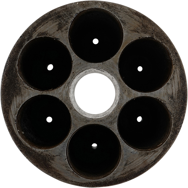 作動については完全で、ハンマーのハーフ/フル・コックについてはしっかりと掛かり、シリンダーも正常に回転します。 フル・コック位置でトリガーを引くと、ハンマーがスムーズに落ちます。 銃身内は銃口から銃身後部まで完全に抜けて (通って) おり、やや表面錆は見られるものの、ライフリングも比較的はっきりと確認出来ます。 コルト系リボルバーの持病とも言える銃身とフレームの取り付けのがたつきについては、現状殆ど見られません。 シリンダーは前後に若干の遊びは見られるものの、あまり気にならないレベルのものです。 ローディング・レバーは左右にやや遊びが見られますが、機能については問題なく、前方に折り畳んだ際のキャッチもしっかりと掛かります。 シリンダーのパーカッション・ニップルについては、やや時代錆が表れているものの、現状大きな欠けや変形等は見受けられず、概ねしっかりとした状態が保たれています。