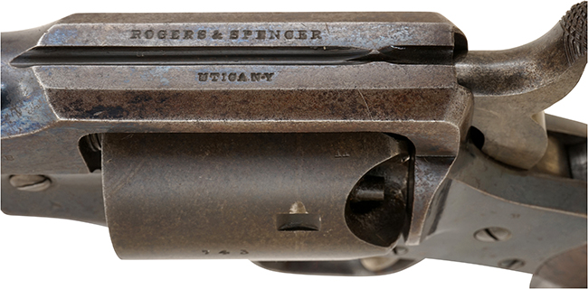 本銃の5条のライフリングが入った7.5インチのオクタゴン銃身とフレーム上部の形状は、レミントン アーミー リボルバーに非常に類似しています。 耐久性の高いレミントン アーミー リボルバーの不足を補う為に製造されただけあり、丈夫なソリッド・フレームは150年以上経った現在でも、しっかりとした重厚さがあります。 トップ・ストラップ (Top Strap) と呼ばれるフレーム上部には、「ROGERS & SPENCER」と「UTICA N.Y」の2行の刻印が入っています。 1850年代の後半にロジャース & スペンサー社はペッテンギル (Pettengill) パーカッション・リボルバーを製造しており、本アーミー・モデルは銃身とローディング・レバーを含む前半分がペッテンギル・リボルバーと同じ生産ラインで製造され、それにレミントン・タイプを改良したフレームを取付けたと言われています。 グリップの左側面には米国陸軍兵器廠の検査官刻印 (Cartouche=カートゥーシュ) が入っている軍用モデルです。(MM)(KK)