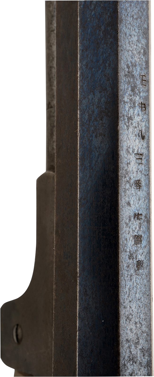 本品は古式銃としては良好な状態が保たれており、銃身やフレーム、トリガー・ガードといった鉄部にはやや小傷や擦れ、若干の表面錆の他、フレーム上面など一部に表面仕上げの剥落が見られるものの、オリジナルのブルー仕上げも大部分に残っています。 シリンダーについても、やや経年による褪色が見られるものの、錆等は比較的少なく、コンディションは概ね良好です。 ローディング・レバーやハンマーについても、オリジナルのケース・ハードン仕上げが大部分に残っています。 白磨きのトリガーは僅かに時代錆が見られるものの、比較的良好な状態が保たれています。 尚、本品の銃身上面には一部薄くなっていますが「壬申 九三番 佐賀縣」と読める壬申刻印が入っています。 オリジナルの木製 (ウォールナット製) グリップについては、やや打ち傷や線傷の他、角の部分に若干の擦れや一部僅かな欠けは見られるものの、大きな破損等は見られず、グリップ・フレームへの取り付けにもがたつきは見られません。