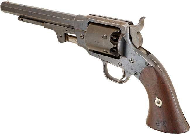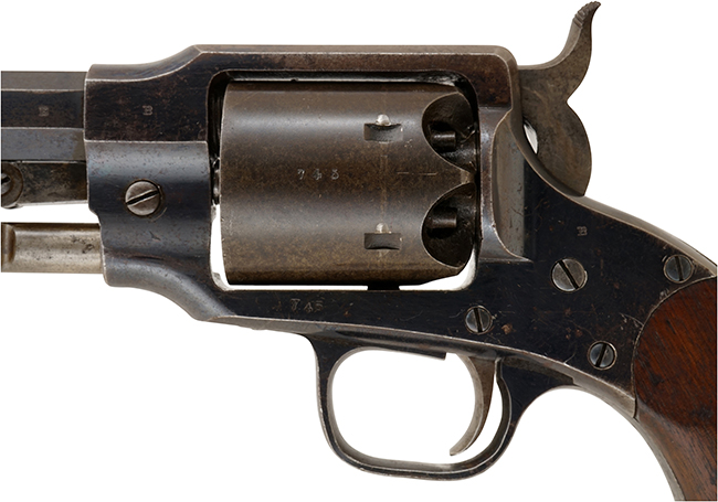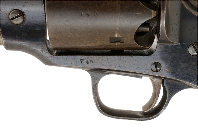 本品のソリッド・フレームの上面には、「ROGERS & SPENCER」及び「UTICA N・Y」の刻印がはっきりと打刻されています。 シリアルNo.は、銃身、フレーム、シリンダー、グリップ・フレームが745でマッチしています。 尚、ローディング・レバーのシリアルNo.は743となっています。 銃身基部やフレーム、シリンダー、トリガー・ガード、グリップといった各部にはロジャース & スペンサー社のサブ・インスペクター刻印である「B」の刻印が打刻されています。 グリップ左側面には、米国陸軍のインスペクター花押とも呼べる、イニシャルが入った刻印 (Cartouche=カートゥーシュ) が打刻されています。 本品には横長の長方形の中に「RPB」と刻印されており、1860-1865年の間に米国陸軍兵器廠の検査官であった陸軍大尉Robert P. Barryが検査した事を示しています (「RPB」はRobert P. Barry大尉のイニシャルです)。 ロジャース & スペンサー アーミー モデルは、基本的に全てが米国政府の注文に基づいて製造された品でしたが、軍に納入された品だけにこの「検査官刻印」が入っています。 反対に言えば、この刻印が無い品は、米国陸軍省に納入された品ではありません。 本銃の米国陸軍省からの注文は5,000挺で、米国に残る最後のシリアル No.が5800である事から、約800挺は陸軍省に納入されずに民間に販売されたと考えられています。 米国ではグリップの「RPB」陸軍検査官刻印の無い品は、その800挺の民間用であるとされています。 南北戦争時に、ほぼ軍用目的オンリーとして製造されたといっても過言ではない、製造数も少ない希少価値の高い品です。