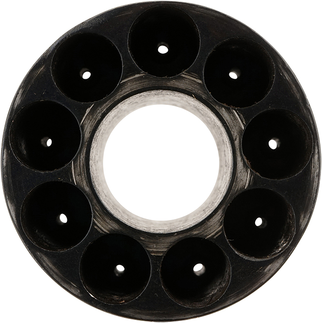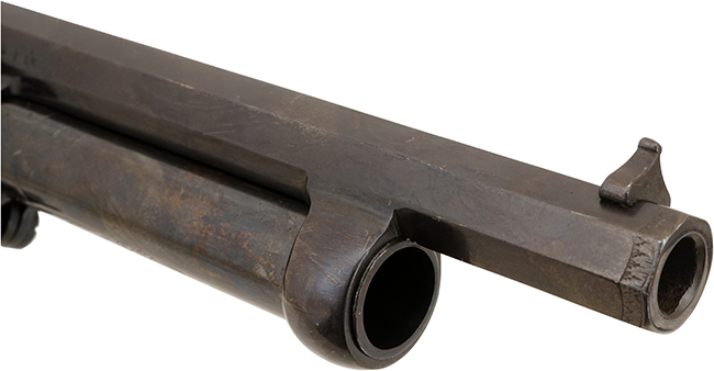 作動については完全で、ハンマーのハーフ/フル・コックはしっかりと掛かり、シリンダーも正常に回転します。 フル・コック位置でトリガーを引くと、ハンマーがスムーズかつ力強く落ちます。 また、特徴的なハンマー先端の切り替えについても問題なく行う事が可能です。 銃身内はいずれも銃口から銃身後部まで完全に抜けて (通って) おり、やや表面錆は見られるものの拳銃側の銃身内のライフリングについても概ねはっきりと確認出来ます。 シリンダーの着脱についても問題なく、シリンダーのパーカッション・ニップルについても、現状目立った変形や欠け等は見受けられません。 ローディング・レバーの操作についてもスムーズに行う事が可能です。