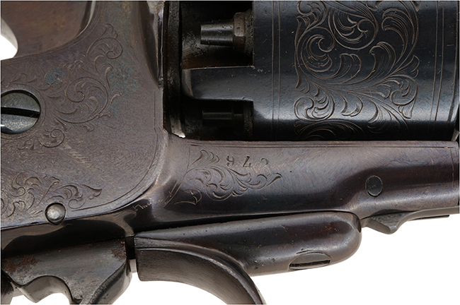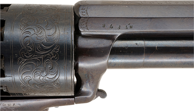 全体的にオリジナル・ブルーが残った上に、新たにプロによるマッチした仕上げが施された新品のような仕上がりです。 国内にある唯一のル・マット拳銃としはそれ以外の個体説明が不要な素晴らしい一挺です。 銃身の上に「Col. Lemat Bte s.g.d.g. Paris」の刻印とフレーム右側面前部に「948」のシリアル No.及び星とLMの文字を組み合わせた刻印が入っています。 木製グリップについても、若干の打ち傷や線傷の他、左側面の取付基部に一部ヘアライン・クラックが見られるものの、現状大きな破損等は見られず、取り付けについても目立ったがたつき等は見られません。