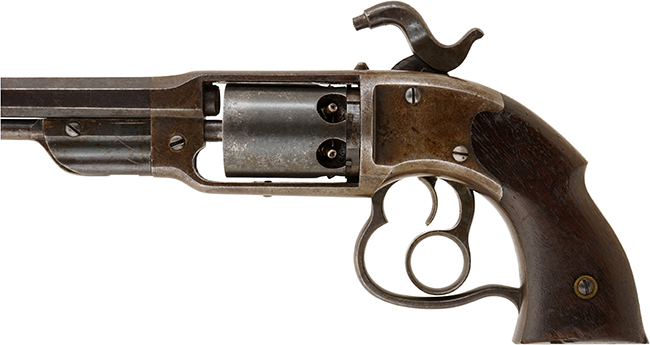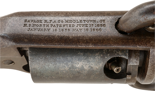 本品のフレーム上面には「SAVAGE R.F.A Co. MIDDLETOWN. CT.」のメーカー刻印に加えて、ヘンリー・S・ノースのパテントを示す「H.S.NORTH PATENTED JUNE 17 1856 JANUARY 19 1859 MAY 15 1860」の刻印がハッキリと打刻されています。 シリアルNo.は1501と1588のダブル・シリアルで、グリップ・パネルを外したグリップ・フレーム右側面に打刻されています。