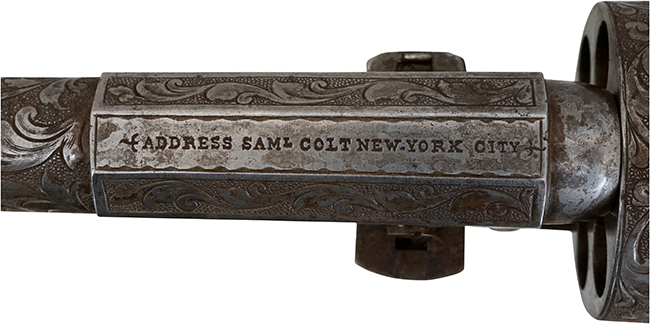 本品はコルト M1848 ドラグーン リボルバー 3rd Modelで、銃身長が7 1/2インチのタイプとなっています。 本品はシリアルNo.15249から1855年製である事が判ります。 ローディング・レバー・ラッチは縦型のタイプを備えており、バレル・ラグ右側面のローディング・カットアウトは、面取り及び拡大が行われた、シリアルNo.が概ね13000以降の個体に見られる3rdモデルとしては後期の仕様となっています。 銃身基部上面には「-ADDRESS SAML COLT NEW-YORK CITY-」の刻印が確認出来ます。 フレーム左側面前方の「COLTS PATENT」刻印についてははっきりと確認出来ます。 銃身やフレーム、シリンダー、ローディング・レバー、トリガー・ガード、バック・ストラップといった金属部には、当時の物と思われる緻密なスクロール・エングレービングが施されています。 本品のシリアルNo.は、銃身、フレーム、トリガー・ガード、バック・ストラップ、シリンダー、シリンダー軸、ローディング・レバー、バレル・ウェッジが(1)5249と全てマッチしています。