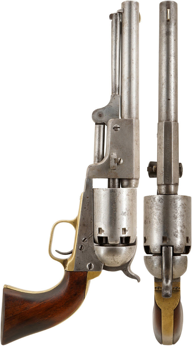 前身となったコルト ウォーカー (ウォーカー・コルト) リボルバーは、サミュエル・コルトがテキサス・レンジャーのサミュエル ・ハミルトン・ウォーカー大尉からの書簡による依頼に基づいて、コルト パターソン リボルバーの設計を基に1846年に開発した、.44口径 6連発の軍用リボルバーです。 コルト ウォーカー リボルバーは、1847年に約1,100挺のみが製造されましたが、その内約1,000挺が米国戦争省からの受注であり、他に約100挺が民間市場向けとして生産されました。 コルト社は軍との契約を履行する為、イーライ・ホイットニー社に生産を委託しました。 コルト ウォーカーのシリンダーにはウォーカーの叙述に基づき、「ウォーカーズ・クリークの戦い」と呼ばれる1844年に発生したテキサス・レンジャーとインディアンの戦闘場面が入っていました。 この戦闘は、テキサス・レンジャーの部隊全体がコルト製リボルバーを戦闘で使用した最初の事例として知られています。 コルト ウォーカーは当時としては非常に強力なリボルバーでしたが、極めて大型かつ重量が重かった点に加え、シリンダーの破裂事故の頻発やローディング・レバーの固定機構が不十分であるといった欠点がありました。