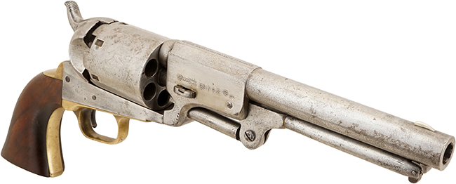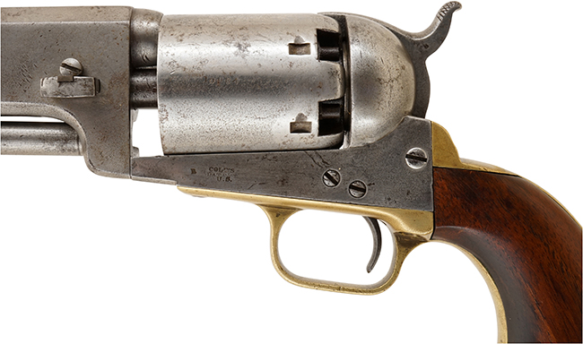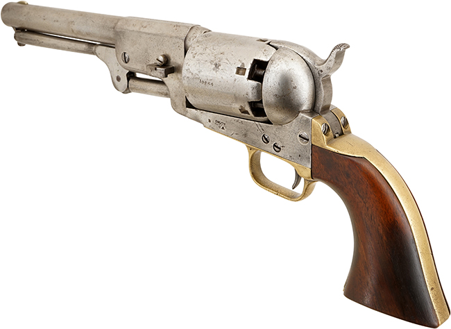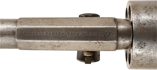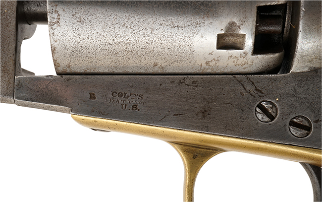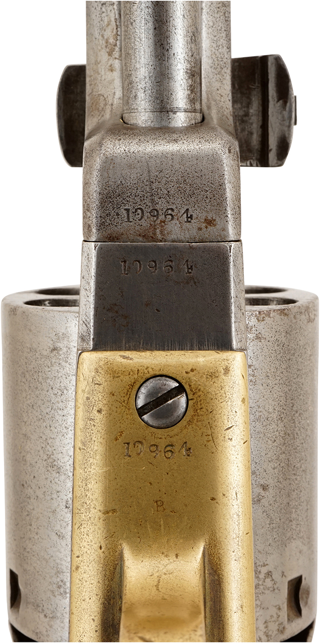 本品はコルト M1848 ドラグーン リボルバー 3rd Modelで、銃身長が7 1/2インチのタイプとなっています。 本品はシリアルNo.10964から1851年製である事が判ります。 ローディング・レバー・ラッチは縦型のタイプを備えており、バレル・ラグ右側面のローディング・カットアウトは、面取り及び拡大が行われていない、シリアルNo.が概ね13000以前の個体に見られる3rdモデルとしては前期の仕様となっています。 銃身基部上面には「-ADDRESS SAML COLT NEW-YORK CITY-」の刻印が確認出来ます。 フレーム左側面には一部薄くなっていますが、「COLTS PATENT」及び「U.S.」の刻印が確認出来ます。 尚、シリンダー表面のロール・エングレービングについては、一部を僅かに残して現状確認出来なくなっていますが、シリンダーのシリアルNo.は確認可能です。 本品のシリアルNo.は、銃身、フレーム、トリガー・ガード、バック・ストラップ、シリンダー、シリンダー軸が(10)964でマッチしており、ローディング・レバーについては打ち直しでマッチしています。 尚、バレル・ウェッジのシリアルNo.は打ち直しによりC21となっています。