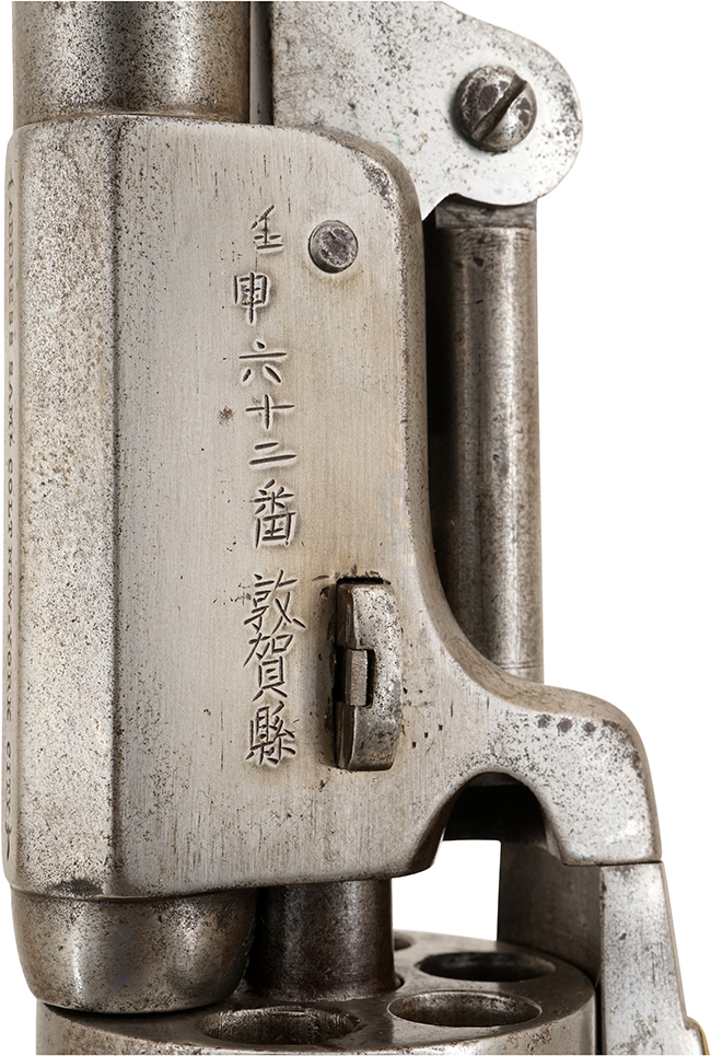 明治4年に明治陸軍は主力小銃の統一化を図る為、旧藩に残る銃砲の種類、挺数の把握が急務となりました。 翌明治5年 (1872年、壬申) 1月から、太政官布告第28号第五則の「銃砲取締規則」によって、私蔵されていた銃砲の「我が国初の管理統制」が始まりました。 廃藩時に旧藩は旧家臣に軍用銃を下付した事例が多く見られ、旧士族の家には一挺の軍用銃があったとも言われています。 それらの銃はその後市中に大量に出回り私蔵されていました。 銃砲取締規則ではこれらの私蔵されていた銃砲について、管轄庁 (東京と大阪は武庫司) に持参して改刻印式によって番号、官印を受ける (これが明治5年度であれば壬申刻印と番号) 事が義務付けられました。 同時に管轄庁は同人名と番号を管轄鎮台に届け出て、鎮台より武庫司にそれらが提出される仕組みになっていました。 この調査は明治20年代頃まで銃砲調査が行われましたが、明治5年 (1872年=壬申) の調査が最も大々的に行われ、今日この種類の刻印の内90-95%が壬申の年に行われた事から、古式銃に打たれた漢字の刻印をまとめて「壬申刻印」と呼ばれています。 本品は「壬申六十二番 敦賀縣」の刻印が入っている事から、明治5年に敦賀県に届け出が行われた品である事が判ります。 敦賀縣 (敦賀県) とは、明治4年 (1871年) に越前国今立郡・南条郡・敦賀郡および若狭国一円の区域をもって発足した県で、1873年(明治6年)に足羽県が編入され、その範囲はほぼ現在の福井県全域に相当します。
