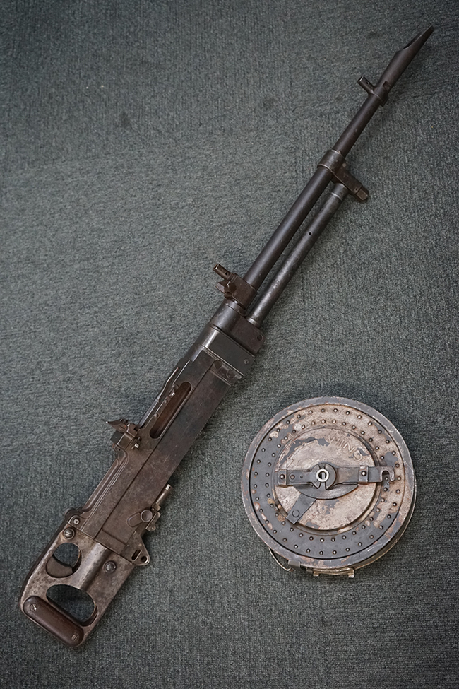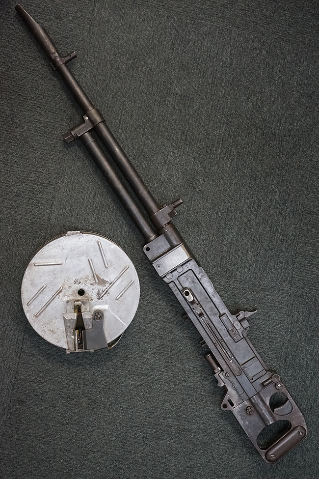 作動方式はロング・ストローク・ピストンを用いたガス圧利用式で、ガス・シリンダーは銃身下部に配置されており、ティルティング・ボルト方式の閉鎖機構を備えています。 射撃はオープン・ボルト位置から行われ、射撃機能はフル・オートマチック射撃のみとなっており、給弾は本体上部に装着される100連パン・マガジンから行われました。 レシーバー後部にはスペード・グリップを備えていました。