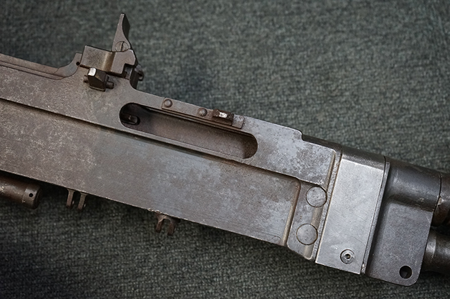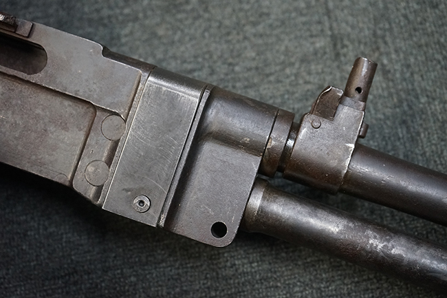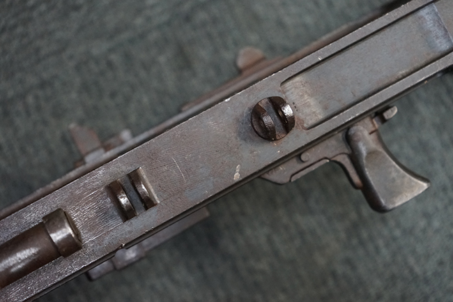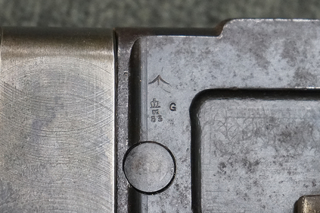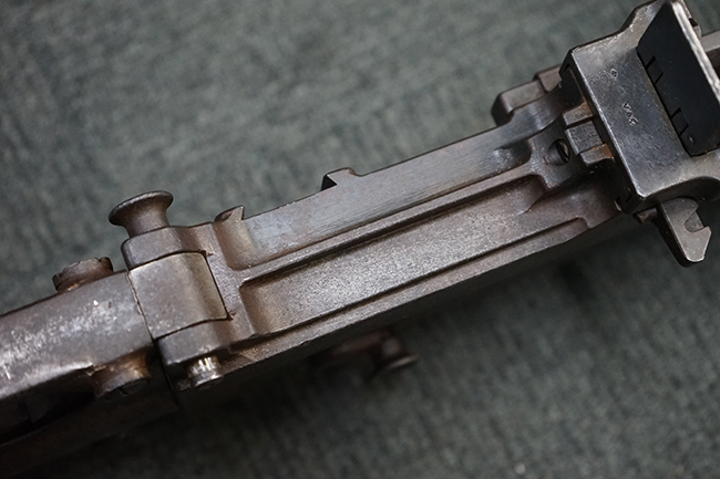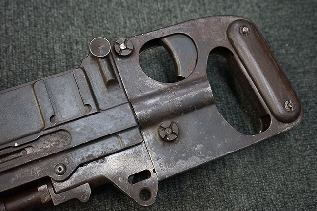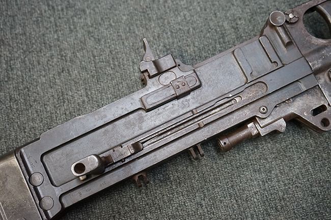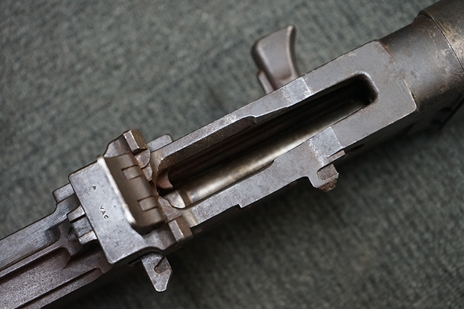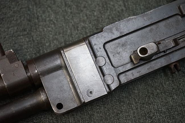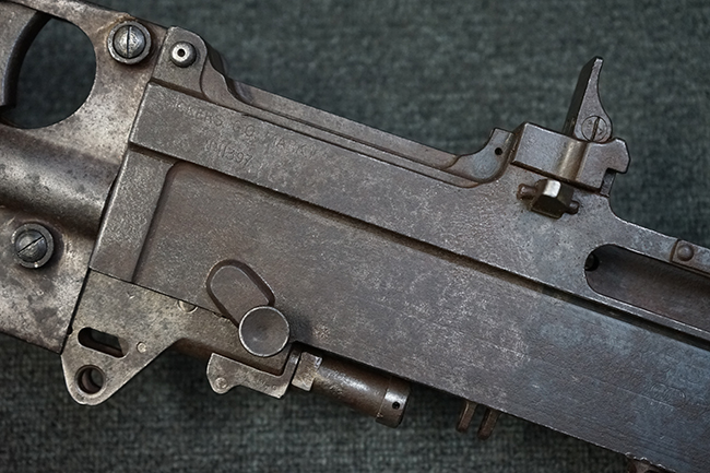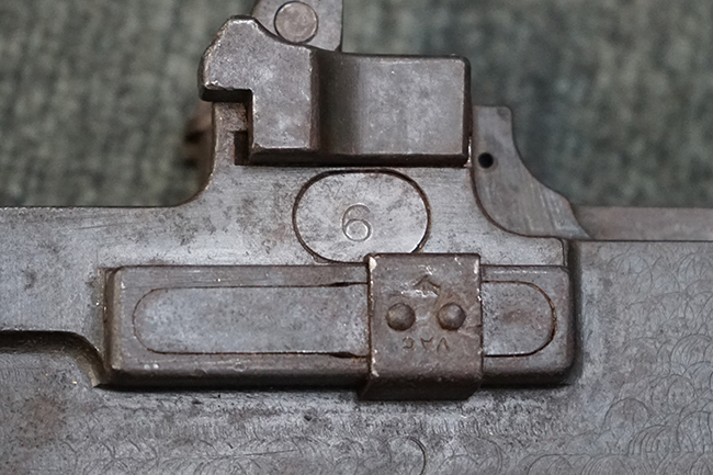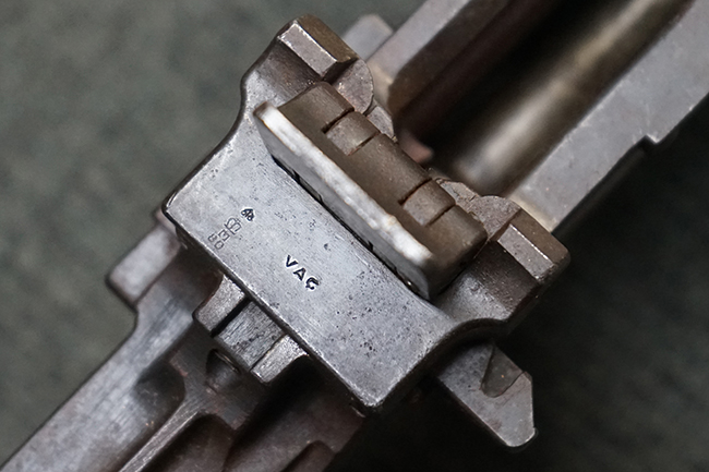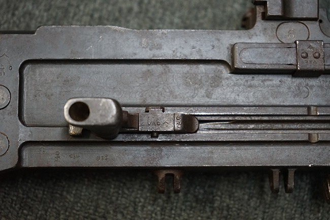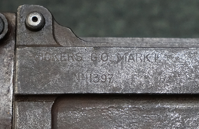 本品のレシーバー後部右側面にはやや見え難いものの、「VICKERS G.O. MARK I」のモデル名に加えて、シリアルNo.11397が打刻されています。 また、各部にビッカース・アームストロング社を示す「VAC」の刻印やブロード・アロー刻印が確認出来ます。