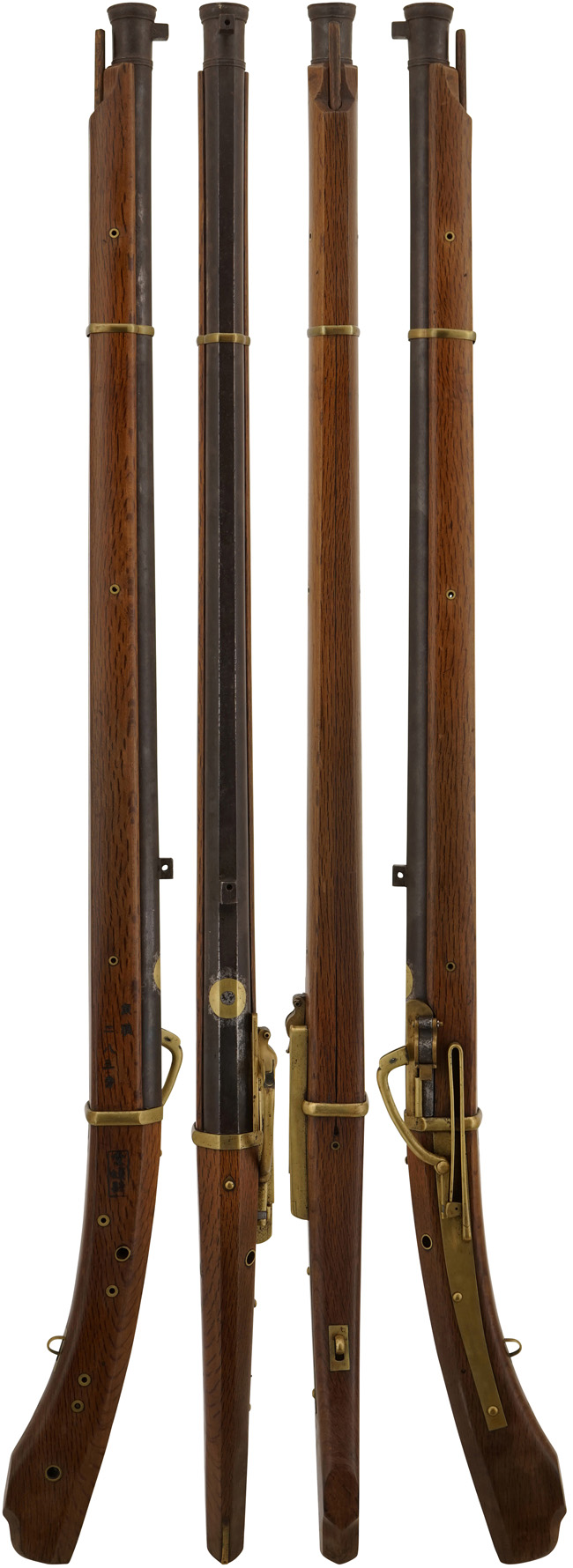 本品の銃身は鉄味も良く若干の表面的な時代錆が見受けられるものの、大きな欠損等は見受けられず、銃床に隠れる銃身下部等の傷み易い部分も含めて非常に良好な状態が保たれています。 銃身下部の目釘金具と銃床の目釘穴の位置は3ヵ所とも一致しています。 銃床は上質な赤樫材と思われる、どちらかと言えば明るい色合いになっています。 使用感も少なく漆仕上げも全体に残った非常に良い状態の品です。 銃床に極僅かな小傷やスレが見られますが、全く気にならない準未使用品のような状態です。 銃床両側のシノギ目(目釘穴)の穴の周りは真鍮製の小さな蛇目で飾られています。 台カブ左側面にある四ヵ所の鋲裏金具もシノギ目と同じ真鍮製の蛇目になっています。 また矢倉鋲裏座も蛇目で合計11個で統一されています。 カラクリの地板金や胴金、雨覆、火蓋といった真鍮部分についても、手入れされて磨かれていますが、程よい時代も付いています。銃身内は銃口から銃身後部まで綺麗に整備され抜けて(通って)おり、火穴も完全に通っています。 尾栓の脱着は問題なく、尾栓は外れますの筒内も非常に綺麗で掃除も容易に行えます。カラクリの作動については良好で、火挟を起こした際のロックは非常にしっかりと掛かり、火挟が起きた状態で引金を引くと、火挟が力強く落ちます。 木製のかるか(さく杖)が付属致します。シンプルながらも造りと状態の良い一挺です。 元の持ち主は実射に使っておられてよく整備されています。 そのため真鍮製の家紋周りと火皿の色が若干落ちていますが、全く許容範囲です。 これから実射や演武に使用される方にお勧めの一挺です。実射される際の安全保障は致しておりませんので、実射における全ての責任はご本人で負って下さい。 画像では付けていませんが「朱色の火縄」が付属しています。(MM)