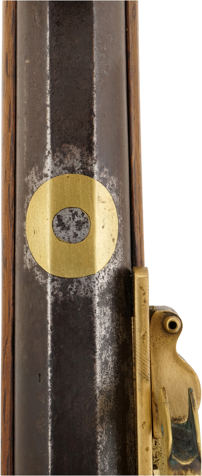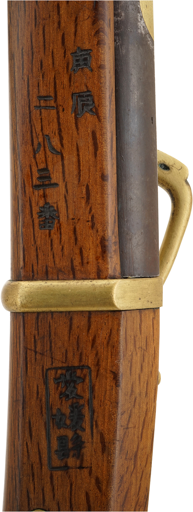 本品の台 (銃床=ストック) 後部左側面には焼印により「庚辰 一八四番」及び「愛媛縣」の「庚辰刻印」が確認出来ます。 庚辰 (かのえたつ、こうきんのたつ、こうしん) とは干支の一つで、明治13年 (1880年) を表します。 これは「銃砲取締規則」に基づいて行われた調査の一環として打刻されたもので、壬申刻印が最初の調査となっています。 壬申 (じんしん) とは干支の一つで、明治5年 (1872年) を表します。 明治5年 (1872年) 一月に太政官布告第28号第五則の「銃砲取締規則」によって私蔵されていた銃砲の「我が国初の管理統制」が始まりました。 廃藩時において旧藩は旧家臣に軍用銃を下付けする事が多く、旧士族の家には一挺の軍用銃があったとも言われています。 それらが大量に市中に出回り私蔵されていました。 それらの銃砲は管轄庁 (東京と大阪は武庫司) に持参して改刻印式によって番号、官印を受ける (これが明治5年度であれば壬申刻印と番号) 事を義務付けました。 同時に管轄庁は同人名と番号を管轄鎮台に届け出て、鎮台より武庫司にそれらが提出される仕組みになっていました。 その際の刻印が「壬申刻印」です。 本品には「愛媛縣」の「庚辰刻印」が入っており、明治13年に愛媛県において届け出が行われた事が窺えます。