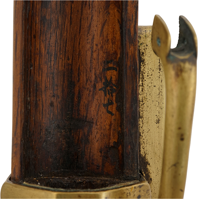 本品は無銘ですが、銃床の左側面(元目当ての後ろ左側の木部)に「庚辰二八三番 愛媛縣」の刻印が入っています。 無銘ながら形状から伊予國(現在の愛媛県)で使用された品と特定できます。 本品の筒(銃身)は後方に向かって緩やかに広がった丸銃身で、上面のみ一段高く平坦となった「表一角」と呼ばれる形状となっています。 銃口部周りには寸の詰まった丸柑子が設けられています。 柑子の後ろ約28mmが丸銃身になっており、両端が綺麗に筋立された玉縁(化粧飾りの輪)があり、その後ろから丸銃身が始まります。本品の先目当は四角柱の「筋割」です。 元目当も「筋割」です。銃身は台(銃床)に対して蛇目金具で補強された3箇所の目釘(穴)と幅の狭い(幅6.4mm)台締金により固定される構造となっています。 台の下面にある背割の後ろの矢倉鋲裏座は蛇目になっています。 カラクリは外カラクリ(蟹目カラクリ) で、カラクリの地板金や胴金(幅約10.2mm)、火挟、雨覆、火蓋、楔、引金、芝引金といった部品は真鍮製となっています。 元目当ての後ろに「伊予國大須藩加藤家蛇目紋」の真鍮象嵌が施されています。 装飾的なものはこの家紋だけで、これ一つで全体的に引き締めている効果があります。 舌形の透かし引金には用心金は設けられていません。 台カブの握る部分には段差はなく、引金部分から駒型まではなだらかな曲線を描いており、台カブ後部上方が「冠落とし」になっている形状が伊予の細筒と同じ特徴です。非常に握り易く伊予で使われた筒に多い形状です。 シンプルな真鍮製の芝引金が銃尾の部分で剣先形になっています。 台カブ左側面の裏座は全て蛇目で他の金具と統一されています。 中筒には珍しい火縄通しの孔と外カラクリが特徴です。(MM)