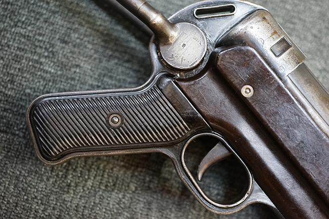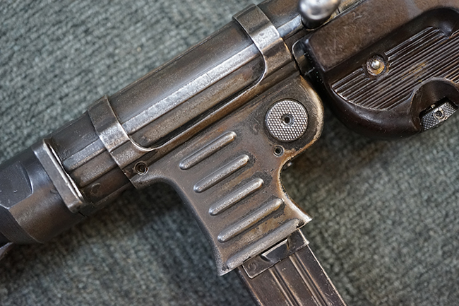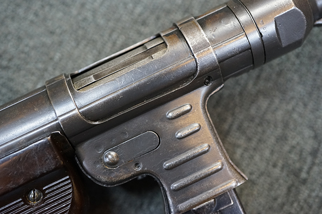 1943~1944年頃にステアー社で製造されたMP40短機関銃の最終型では、レシーバー・エンド・キャップとロア・レシーバーをプレスにより一体成型しているのが特徴です。 このタイプでは、プレスにより鋼板を折り込む方法でロア・レシーバー全体を成形しており、エンド・キャップ上面からロア・レシーバーの外縁部にかけて補強板のように見える板状の継ぎ目が見られます。 バレル・レストは1943年にエルマ社で製造されたタイプと同様にプレス製となっています。