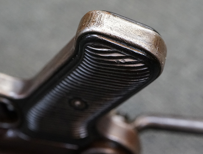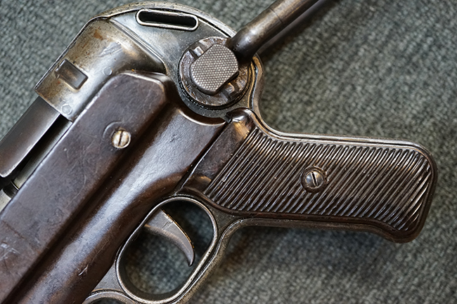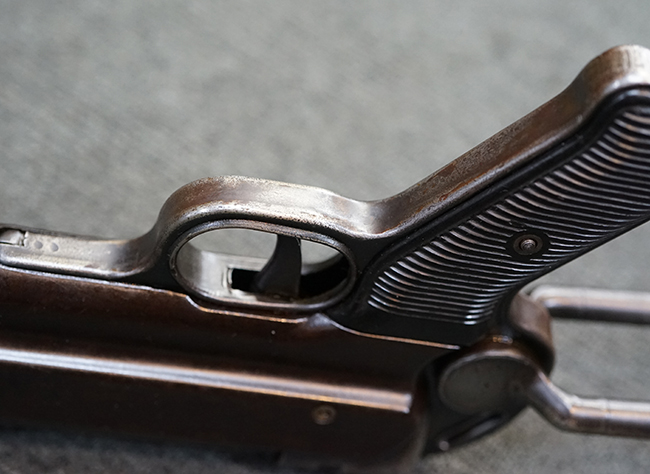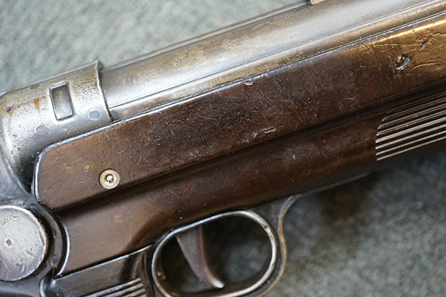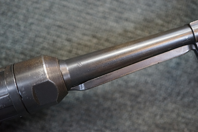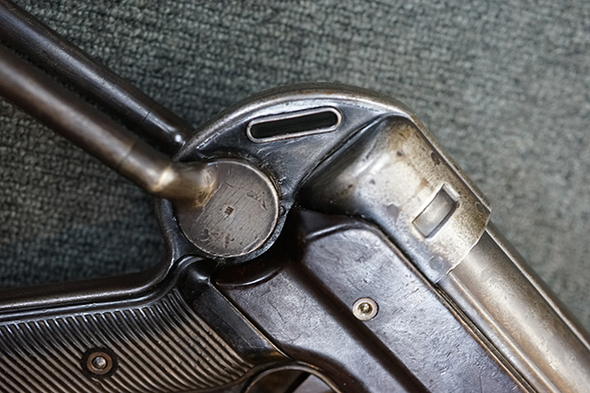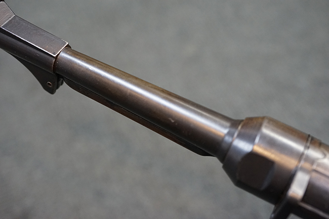 本品は全体に使い込まれたコンディションとなっており、金属部はやや打ち傷や表面錆痕の他、仕上げが落ちて金属の地肌が表れている箇所が見られるものの、大きな欠損等は見られず、概ねしっかりとした状態が保たれています。 樹脂製のハンドガードについても、やや打ち傷や線傷等が見られるものの、こちらも大きな破損等はみられず、レシーバーへの取り付けはしっかりとしています。 上下レシーバーの取り付けについては、がたつきなどは殆ど見られません。 樹脂製のグリップ・パネルについては左右の色味もマッチしており、違和感はありません。 グリップ・パネル表面にはやや打ち傷が見受けられるものの、グリップ・フレームへの取り付けについては、現状目立ったがたつきは見られません。 折り畳みストックは展開時にやや上下に遊びが見られますが、ロック自体はしっかりと掛かっています。