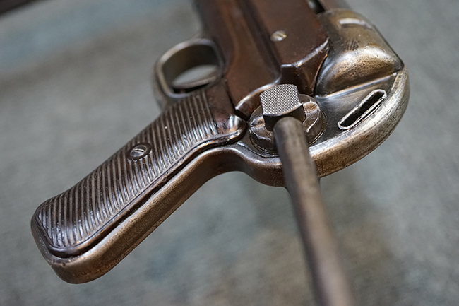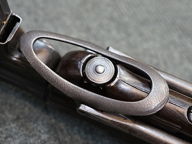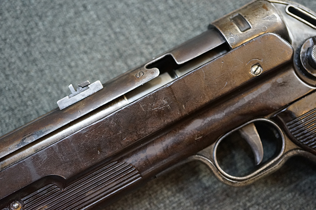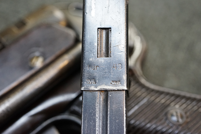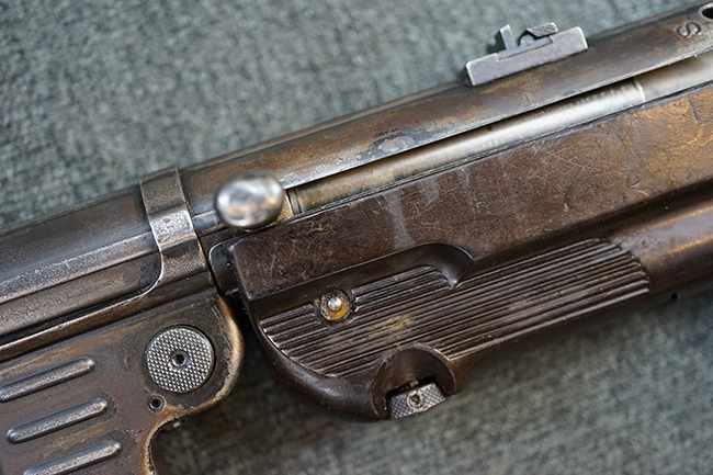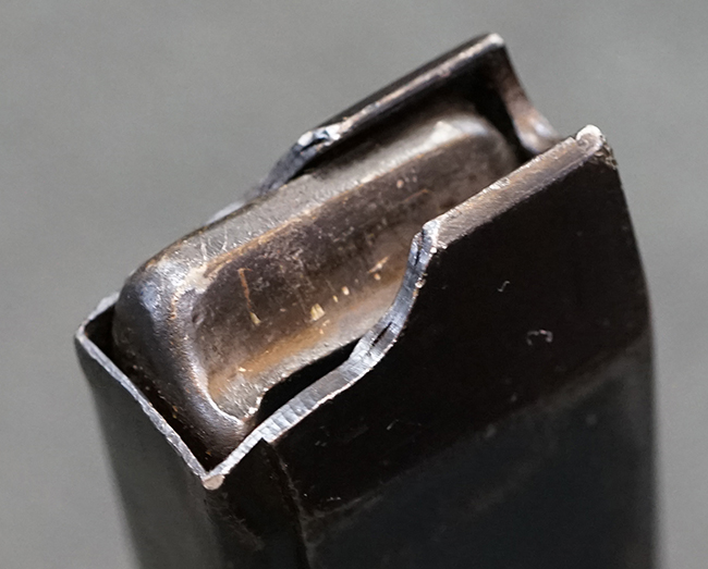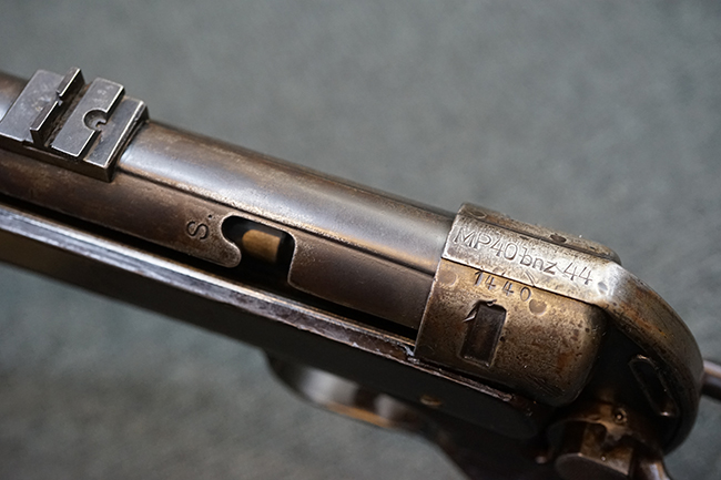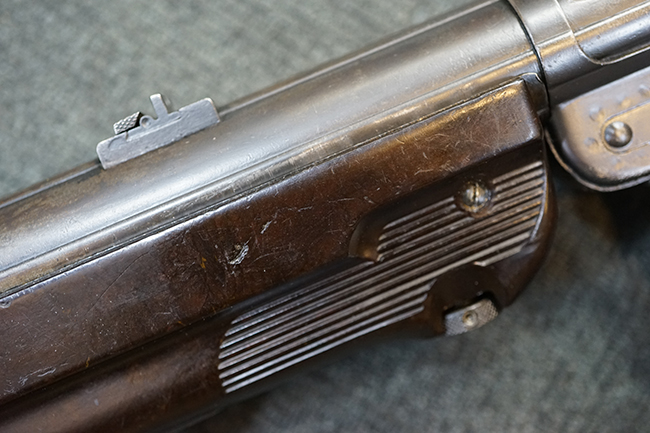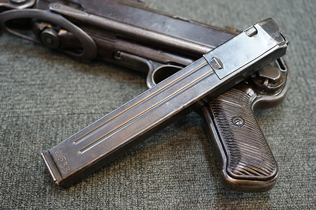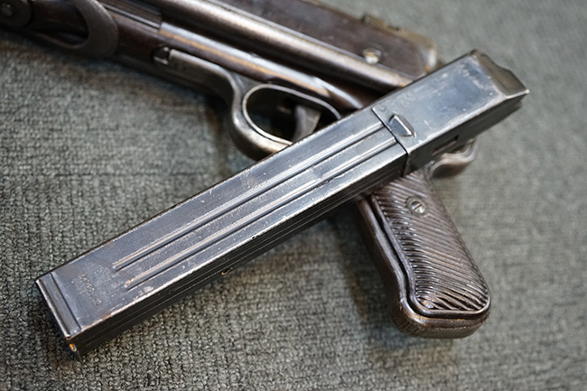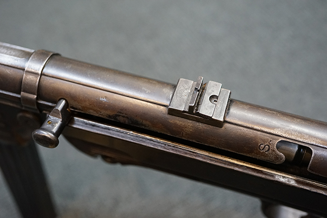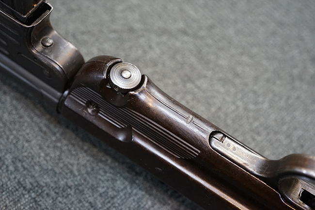 リア・サイトの切り替えやマガジンの着脱については問題なく行う事が可能です。 マガジンは取り付け時にやや遊びが見受けられます。 付属のマガジンには「M.P.38u.40」及び1943年にステアー社で製造された事を示す「kur 43」の刻印が入ってます。 マガジンにはやや打ち傷や経年による褪色、表面錆痕の他、一部僅かな凹みが見受けられます。 尚、マガジン・スプリングは入っています。