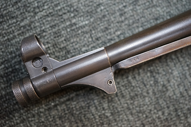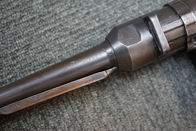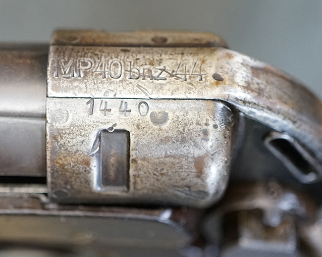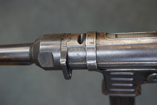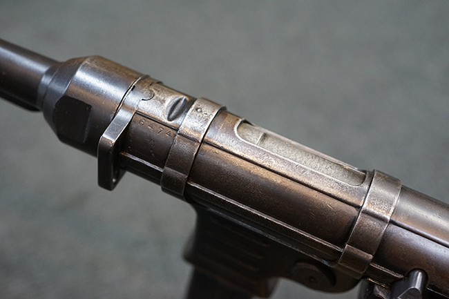 本品のレシーバー・エンド・キャップ上面には「MP40」のモデル名やシリアルNo.1440の他、ステアー社で1944年に製造された事を示す「bnz 44」のメーカー・コードが入っています。 コッキング・ハンドルは1942年半ば以降に本格的に導入されたボルト・セーフティ機能を備えた2ピース・タイプが装備されています。 マガジン・ハウジングは両側面に5本の強化リブが付いたタイプ、バレル・ナットは平面部分が2箇所のみのタイプ、バレル・レストはプレス製、マズル・リングは中央に溝の有るタイプが付いています。 尚、シリアルNo.はロア・レシーバーが1440、アッパー・レシーバー及びリア・サイトが(6)474、銃身とフロント・サイト・ガード、バレル・レストが6510、ストックが977となっています。 その他、各部にアムト刻印が確認出来ます。