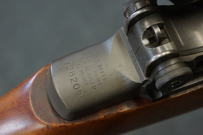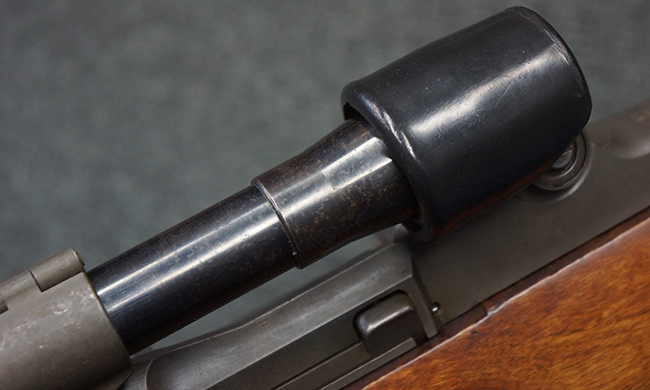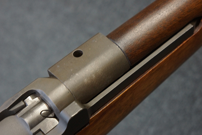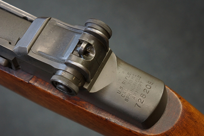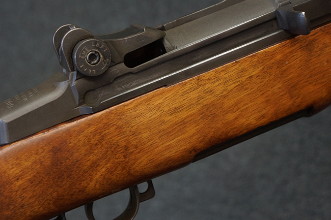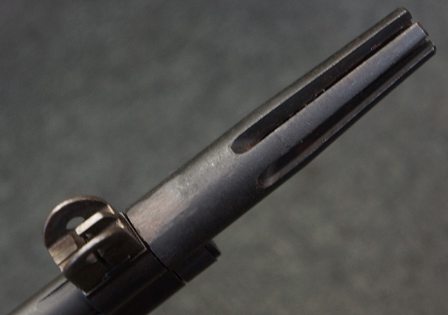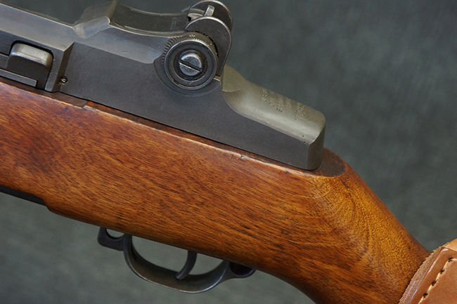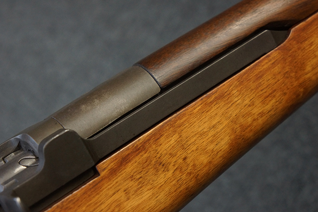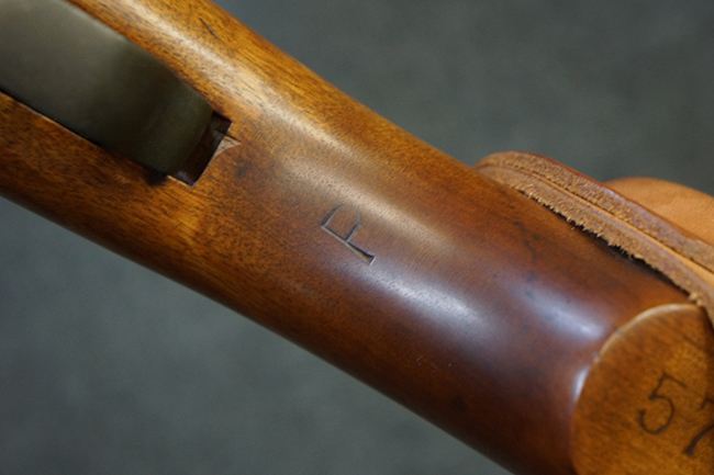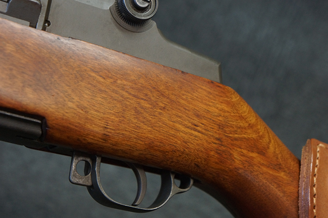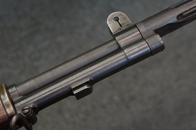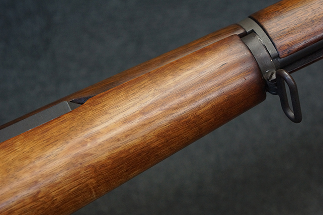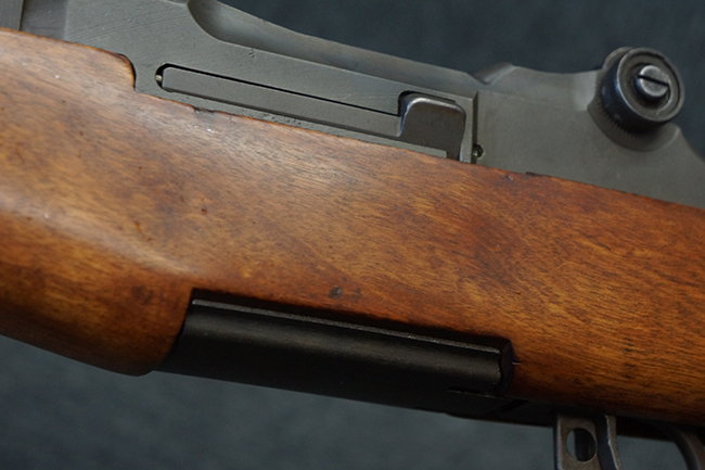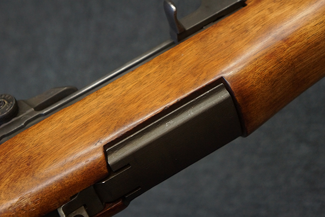 本品はスプリングフィールド造兵廠製で、レシーバー後端上面にはシリアルNo.の他、「U.S. RIFLE CAL. .30 M1」のモデル名刻印及び「SPRINGFIELD ARMORY」のメーカー刻印が入っています。 本品はシリアルNo.から1942年7月に製造された個体である事が窺えます。 トリガー・ハウジングは「D28290-12-SA」の刻印が入った大戦中のスプリングフィールド造兵廠製、ボルトは「D28287-12SA」の刻印が入った大戦中のスプリングフィールド社製、オペレーティング・ロッドは「D35382 SA」の刻印が入った戦後のスプリングフィールド造兵廠製で、トリガー・ガードは削り出し製となっています。 ガス・シリンダーはワイド・ベース・タイプ、ガス・シリンダー・ロック・スクリューは溝が十字のポペット・タイプが付いています。 リア・サイトについては、T105と呼ばれる戦後タイプで、エレベーション・ノブは戦後製、ウィンデージ・ノブについても「BME」の刻印が入ったBruce Machine & Engineering Co.製の戦後型となっています。 銃床の銃把前部には米軍の「P」のプルーフ刻印が確認出来る他、銃把下部に「57」の番号が入っています。 本品にはT37 フラッシュ・ハイダーが取り付けられています。