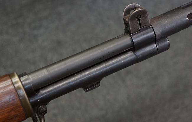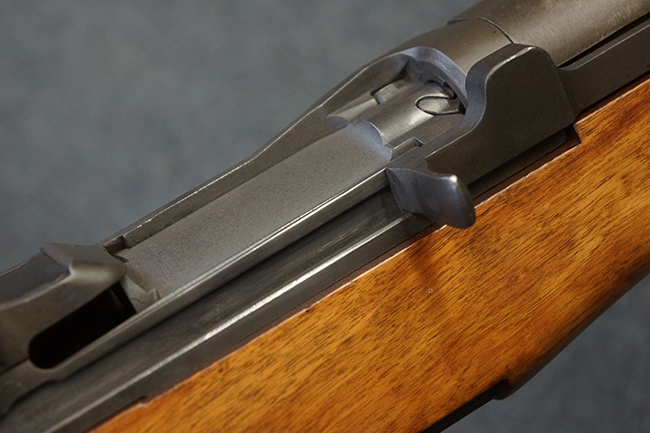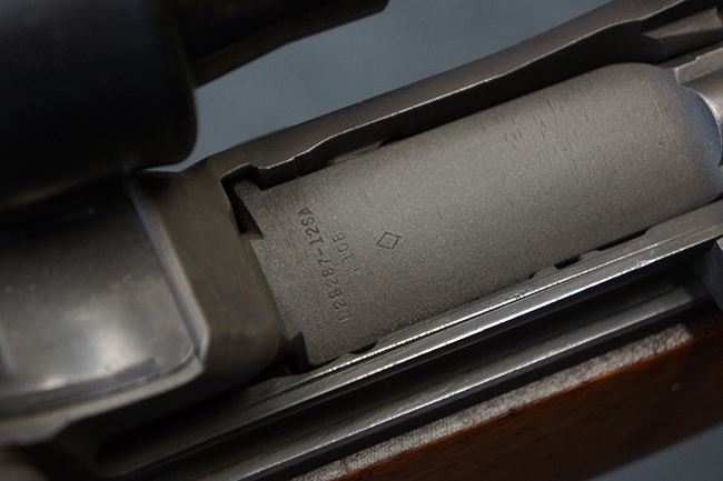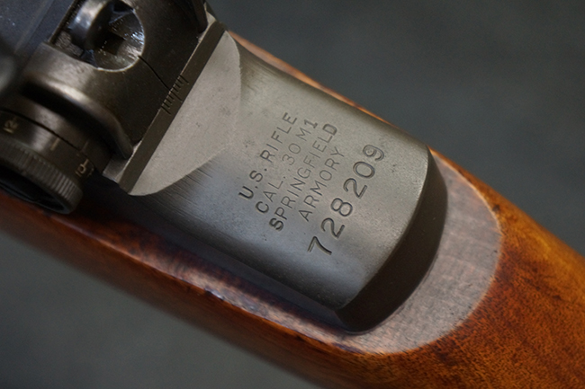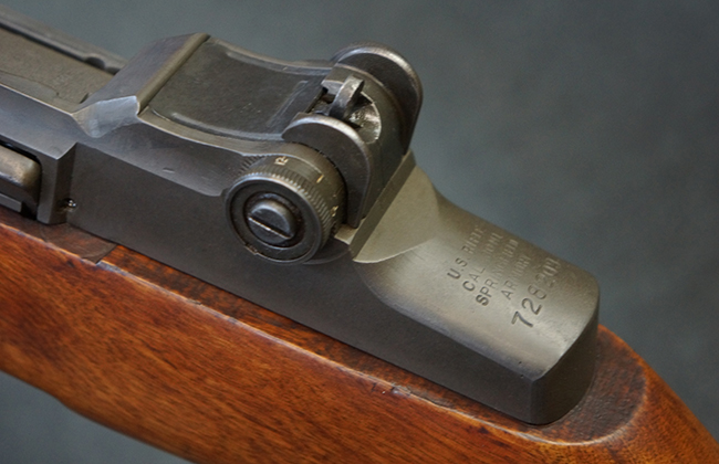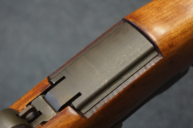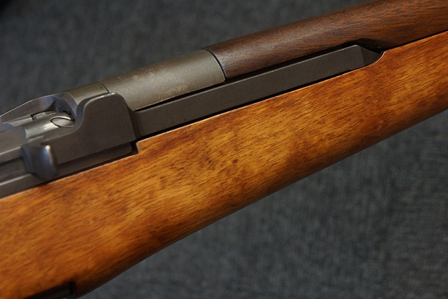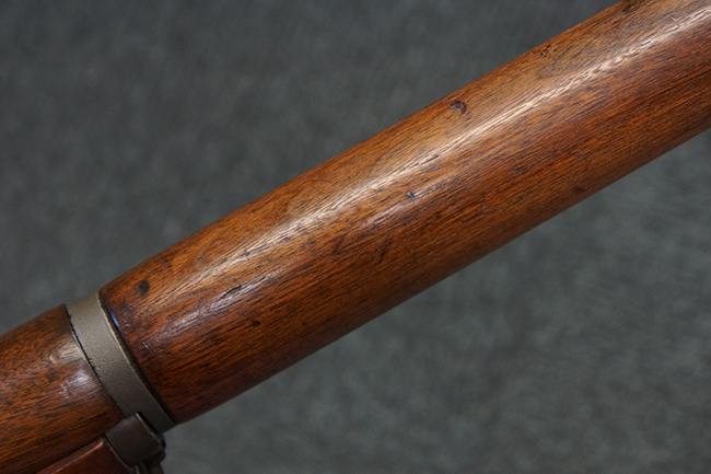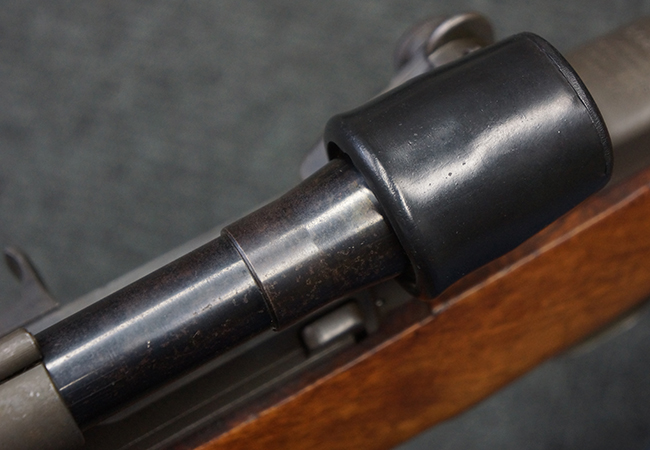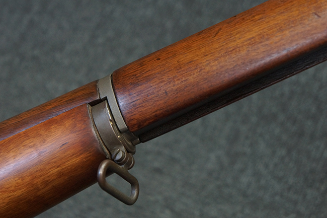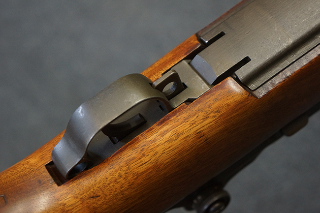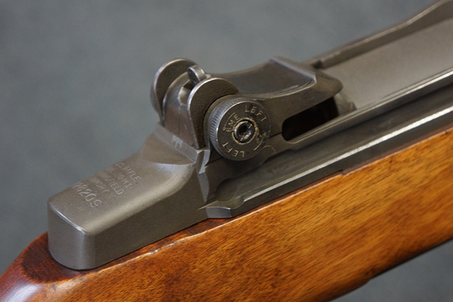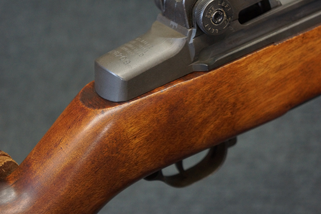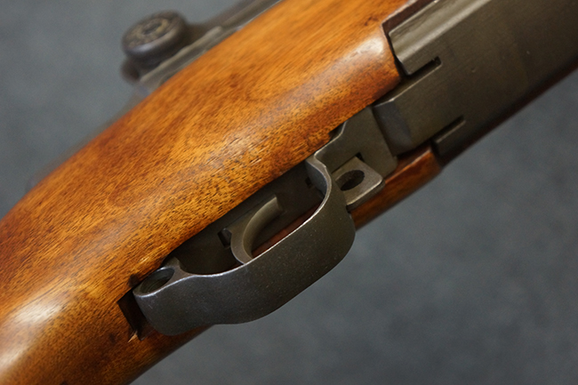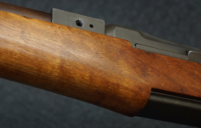 本品はスプリングフィールド造兵廠製で、レシーバー後端上面にはシリアルNo.の他、「U.S. RIFLE CAL. .30 M1」のモデル名刻印及び「SPRINGFIELD ARMORY」のメーカー刻印が入っています。 本品はシリアルNo.から1942年7月に製造された個体である事が窺えます。 トリガー・ハウジングは「D28290-12-SA」の刻印が入った大戦中のスプリングフィールド造兵廠製、ボルトは「D28287-12SA」の刻印が入った大戦中のスプリングフィールド社製、オペレーティング・ロッドは「D35382 SA」の刻印が入った戦後のスプリングフィールド造兵廠製で、トリガー・ガードは削り出し製となっています。 ガス・シリンダーはワイド・ベース・タイプ、ガス・シリンダー・ロック・スクリューは溝が十字のポペット・タイプが付いています。 リア・サイトについては、T105と呼ばれる戦後タイプで、エレベーション・ノブは戦後製、ウィンデージ・ノブについても「BME」の刻印が入ったBruce Machine & Engineering Co.製の戦後型となっています。 銃床の銃把前部には米軍の「P」のプルーフ刻印が確認出来る他、銃把下部に「57」の番号が入っています。 本品にはT37 フラッシュ・ハイダーが取り付けられています。