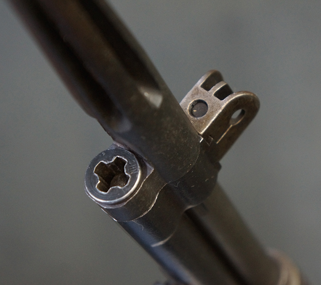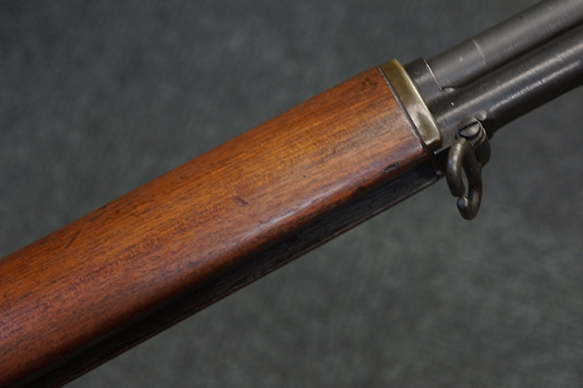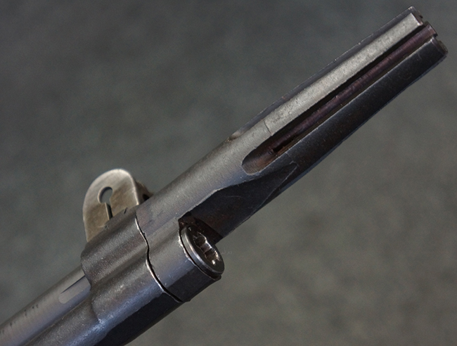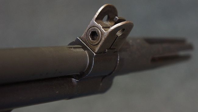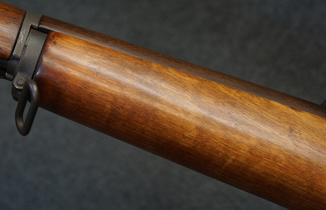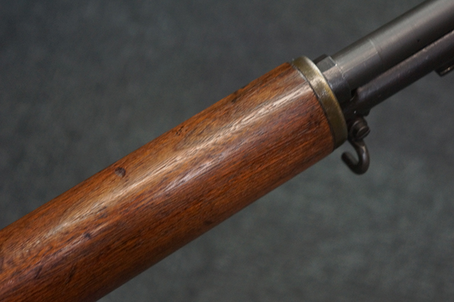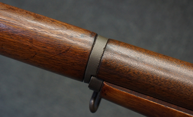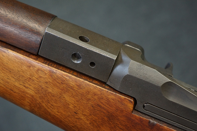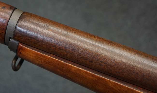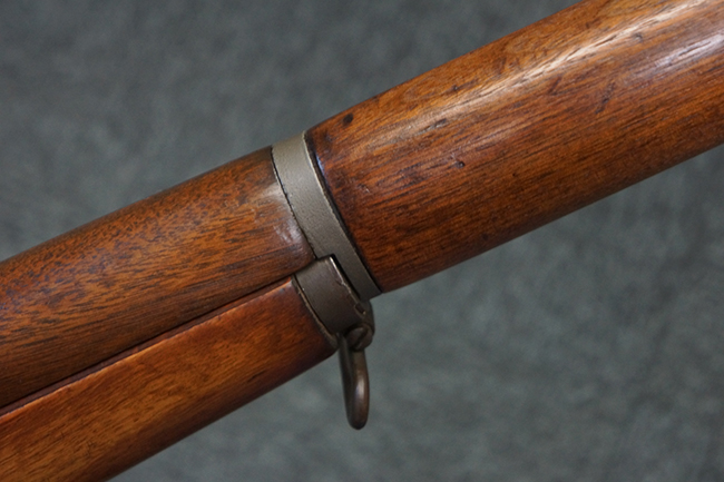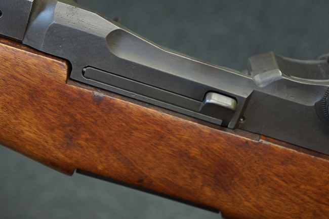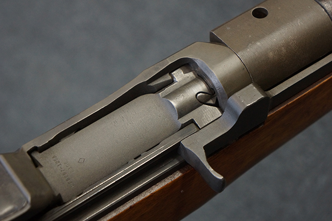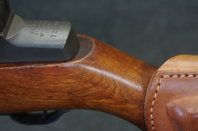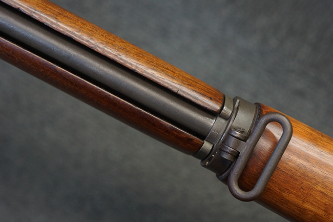 本品はスプリングフィールド造兵廠製で、レシーバー後端上面にはシリアルNo.の他、「U.S. RIFLE CAL. .30 M1」のモデル名刻印及び「SPRINGFIELD ARMORY」のメーカー刻印が入っています。 本品はシリアルNo.から1942年7月に製造された個体である事が窺えます。 トリガー・ハウジングは「D28290-12-SA」の刻印が入った大戦中のスプリングフィールド造兵廠製、ボルトは「D28287-12SA」の刻印が入った大戦中のスプリングフィールド社製、オペレーティング・ロッドは「D35382 SA」の刻印が入った戦後のスプリングフィールド造兵廠製で、トリガー・ガードは削り出し製となっています。 ガス・シリンダーはワイド・ベース・タイプ、ガス・シリンダー・ロック・スクリューは溝が十字のポペット・タイプが付いています。 リア・サイトについては、T105と呼ばれる戦後タイプで、エレベーション・ノブは戦後製、ウィンデージ・ノブについても「BME」の刻印が入ったBruce Machine & Engineering Co.製の戦後型となっています。 銃床の銃把前部には米軍の「P」のプルーフ刻印が確認出来る他、銃把下部に「57」の番号が入っています。 本品にはT37 フラッシュ・ハイダーが取り付けられています。