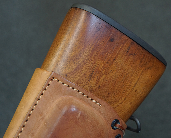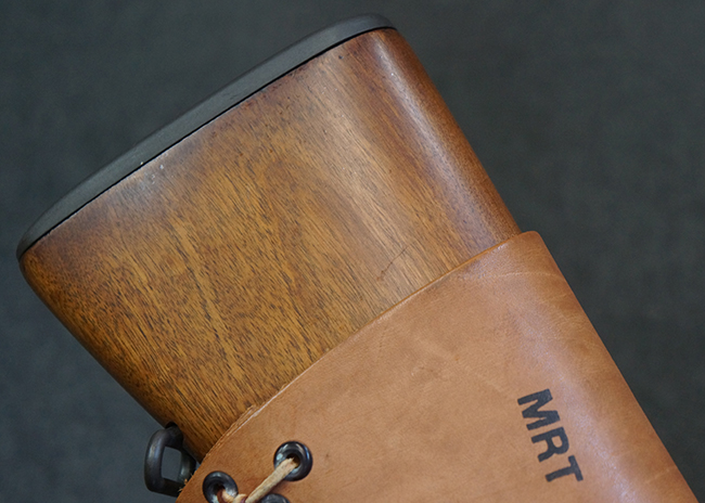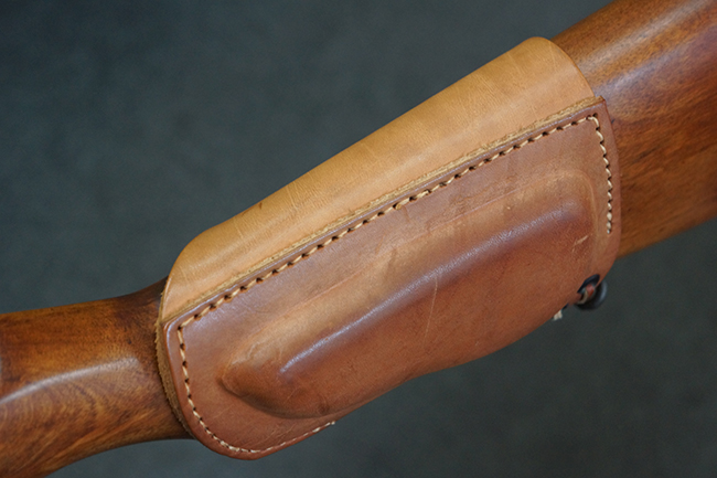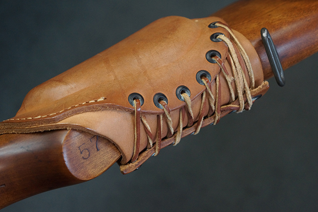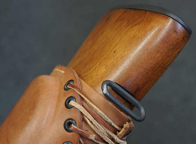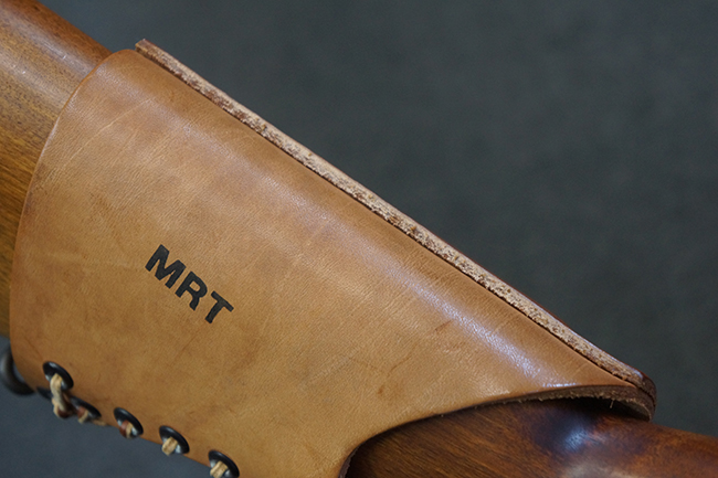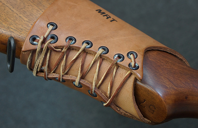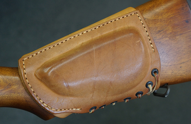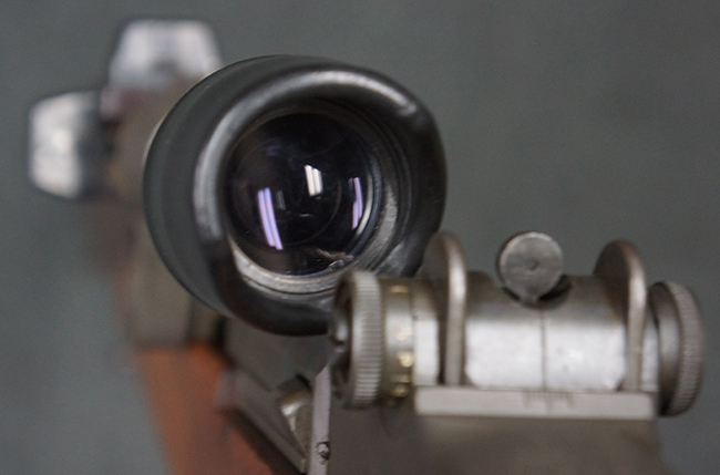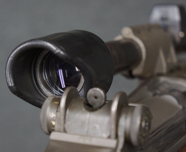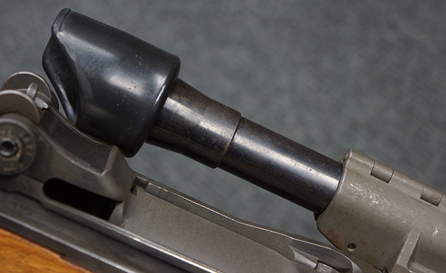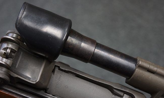 付属のM84スコープは、外装にやや小傷や表面錆が見られるものの、視野内は僅かな塵が見られる程度でクリアな視界が保たれており、レティクルもはっきりと確認出来ます。 ラバー・アイ・ピースについても、現状目立った劣化等は見られません。 銃本体のマウントへのスコープの着脱についても問題なく行う事が可能です。 尚、スコープにはモデル名やシリアルNo.の入ったプレートは取り付けられていません。 復刻品の革製チーク・パッドには目立ったダメージ等も見られず、良好な状態が保たれています。