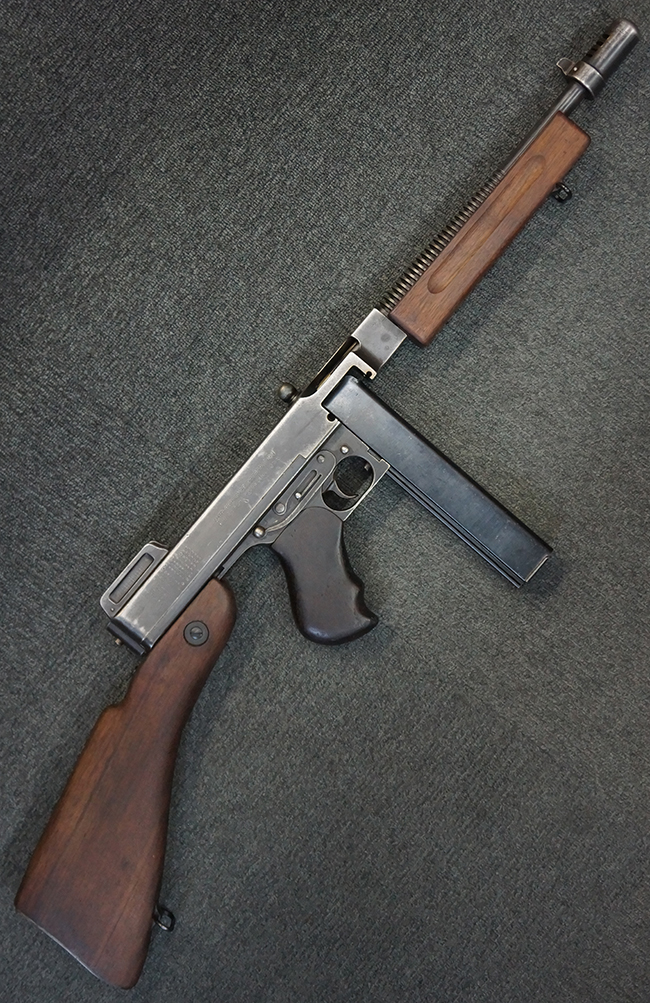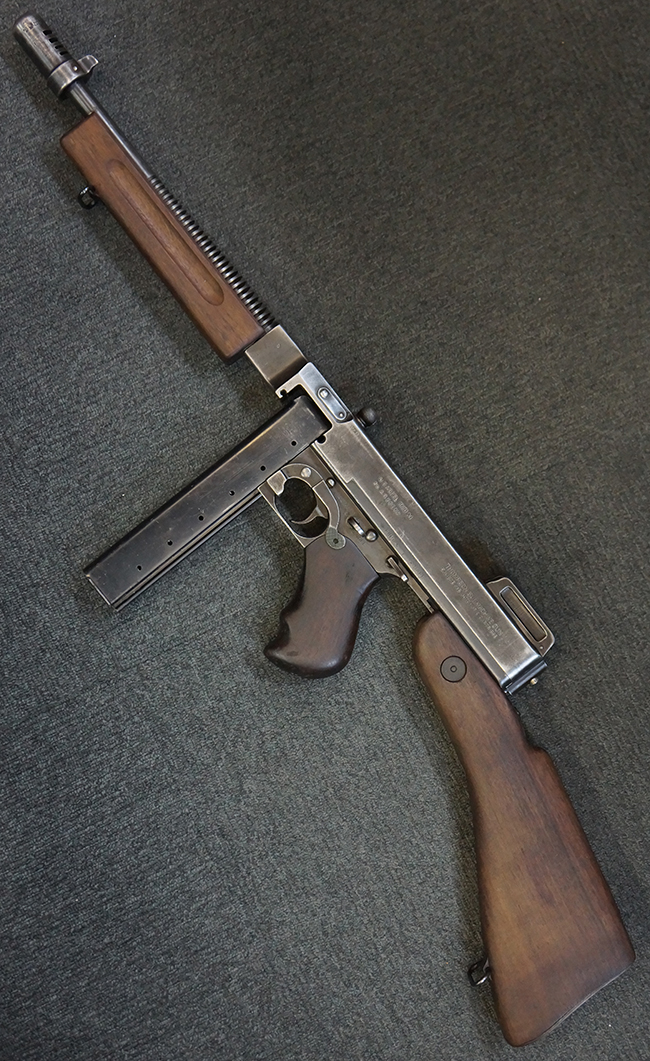 トンプソン短機関銃は元々サブ・マシンガンというジャンルが生まれる前の「個人が携行可能で機関銃のように連射できる武器」というコンセプトから開発が始まりましたが、新たなコンセプトの兵器ゆえ、当初の軍などの評価は決して芳しいものではありませんでした。 そんなトンプソンの最初の有効性を証明したのは軍ではなく、禁酒法時代の景気の良いギャングたちでした。 (この時はM1921とM1927モデルが主であったようです)。 このためオート・オードナンス社とトンプソン短機関銃は一時社会的イメージを落とし、この時期にオート・オードナンス社は経営の最大の危機を迎えたほどです。 ところが皮肉にもギャングたちの使用によりトンプソンの有効性は証明され、連邦捜査局 (FBI) や各地方の治安当局でも、こうした犯罪者に対抗するべくトンプソンM1928短機関銃が採用されました。 それと同じモデルがイギリスでは「トミーガン」の名称でコマンドの象徴と言われました。その後米軍でもニカラグアでの使用で実戦での実績も作り、ついに第二次世界大戦の幕開けと共にトンプソン短機関銃は本格的に各国軍に採用されるようになります。