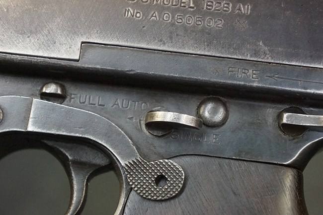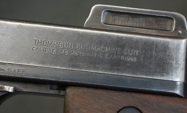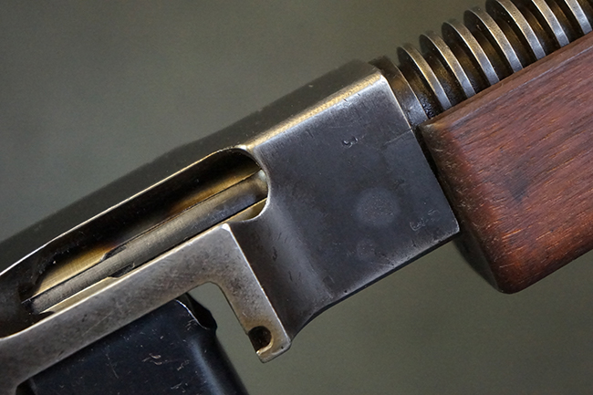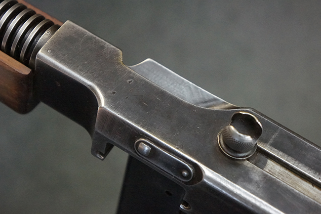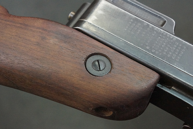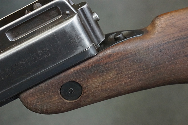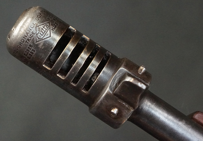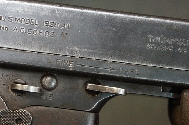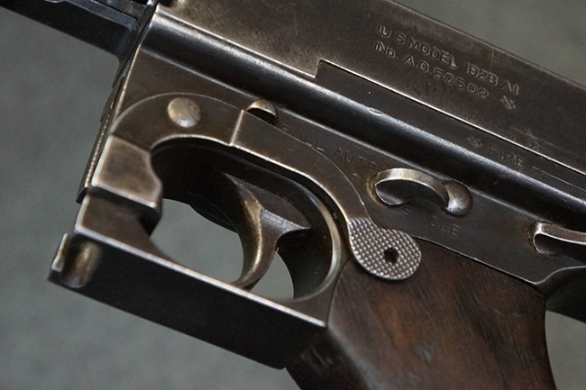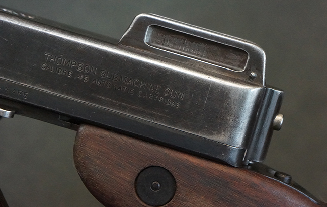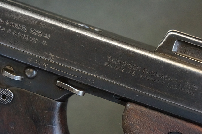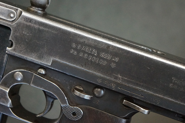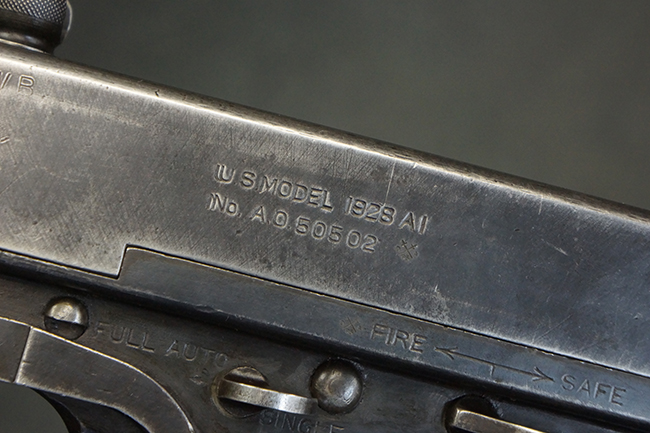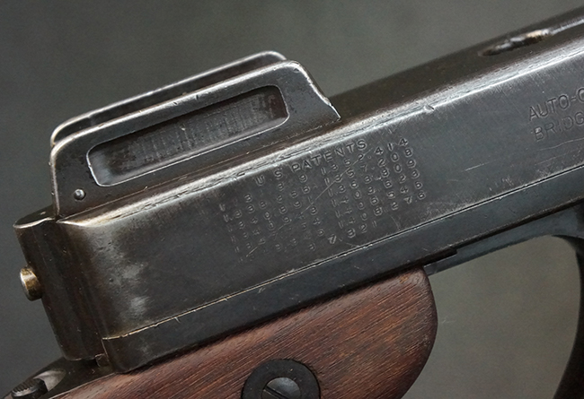 本品のレシーバー左側面にはシリアルNo.の他、「U.S. MODEL 1928 A1」及び「THOMPSON SUBMACHINE GUN CALIBRE .45 AUTOMATIC CARTRIDGE」の刻印が入っています。 また、レシーバー右側面には米国のパテント刻印の他、「AUTO-ORDNANCE CORPORATION BRIDGEPORT, CONNECTICUT,U.S.A」の刻印が入っています。 尚、レシーバー上面にはトンプソンのロゴが入っています。 ロア・レシーバーのシリアルNo.はアッパー・レシーバーのシリアルNo.とマッチしています。 本品はシリアルがAOで始まる事からオート・オードナンス社製であることがわかります。 バレル・フィンがあり、Lyman (ライマン) 社製のラダー・サイトが付いた仕様です。 カッツ・コンペンセーター表面の刻印についてもはっきりと残っています。 尚、セレクター及びセーフティはいずれも削り出しタイプの物が取り付けられています。