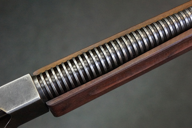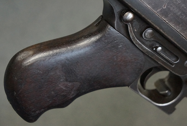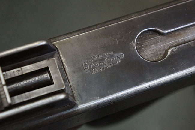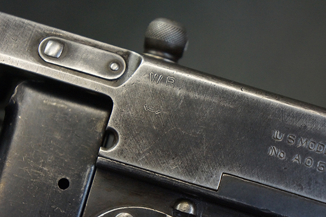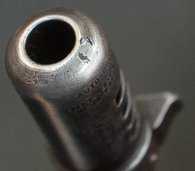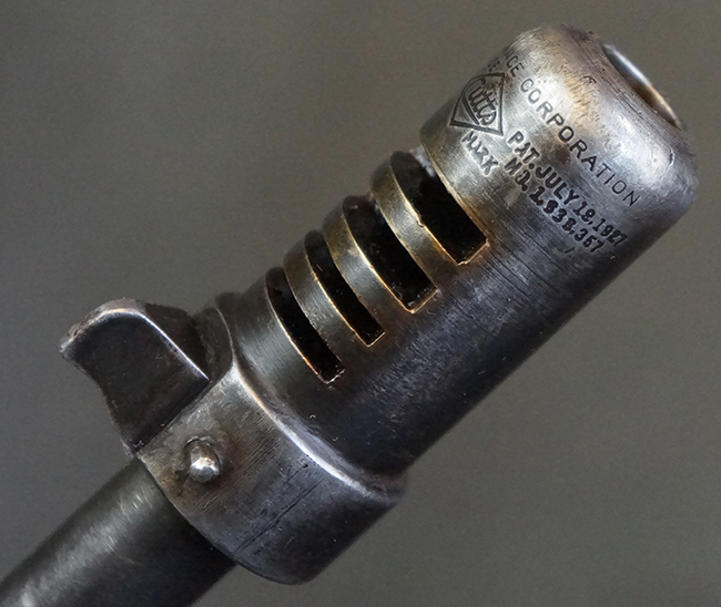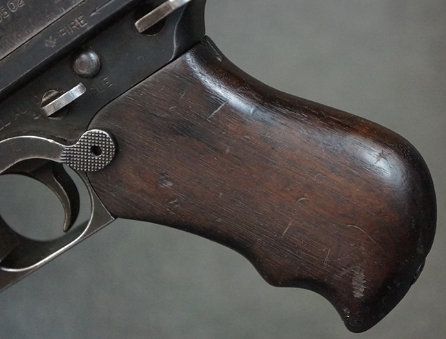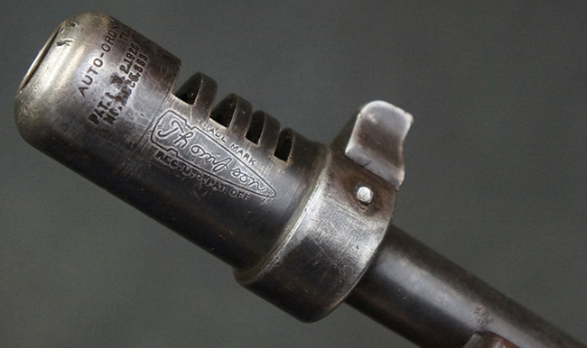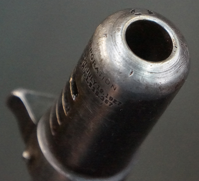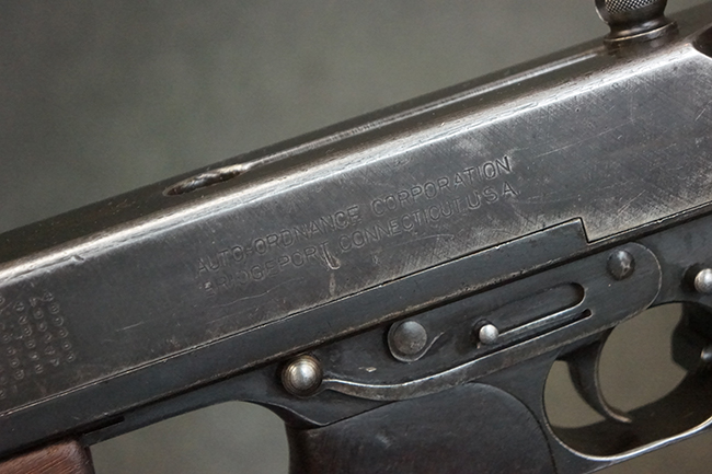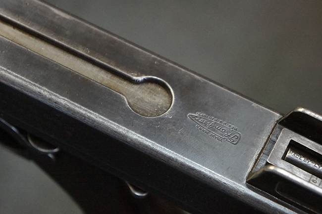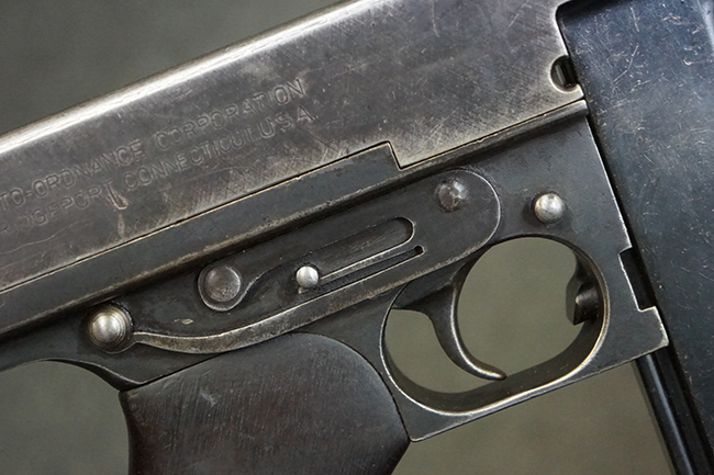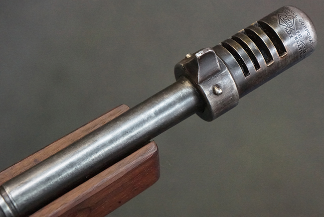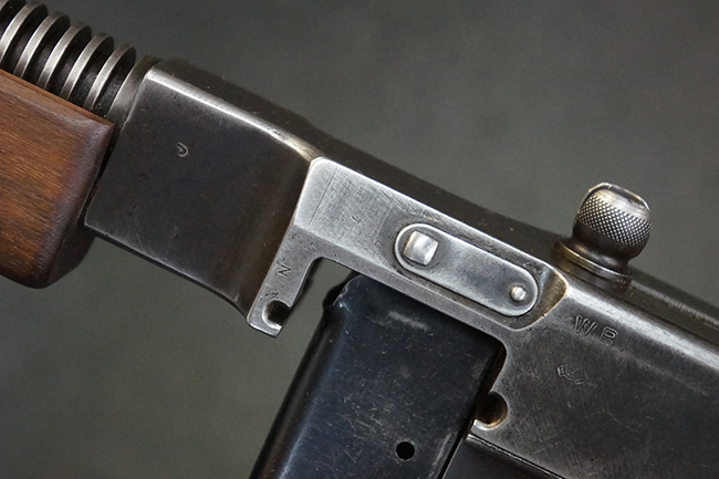 本品のレシーバー左側面にはシリアルNo.の他、「U.S. MODEL 1928 A1」及び「THOMPSON SUBMACHINE GUN CALIBRE .45 AUTOMATIC CARTRIDGE」の刻印が入っています。 また、レシーバー右側面には米国のパテント刻印の他、「AUTO-ORDNANCE CORPORATION BRIDGEPORT, CONNECTICUT,U.S.A」の刻印が入っています。 尚、レシーバー上面にはトンプソンのロゴが入っています。 ロア・レシーバーのシリアルNo.はアッパー・レシーバーのシリアルNo.とマッチしています。 本品はシリアルがAOで始まる事からオート・オードナンス社製であることがわかります。 バレル・フィンがあり、Lyman (ライマン) 社製のラダー・サイトが付いた仕様です。 カッツ・コンペンセーター表面の刻印についてもはっきりと残っています。 尚、セレクター及びセーフティはいずれも削り出しタイプの物が取り付けられています。