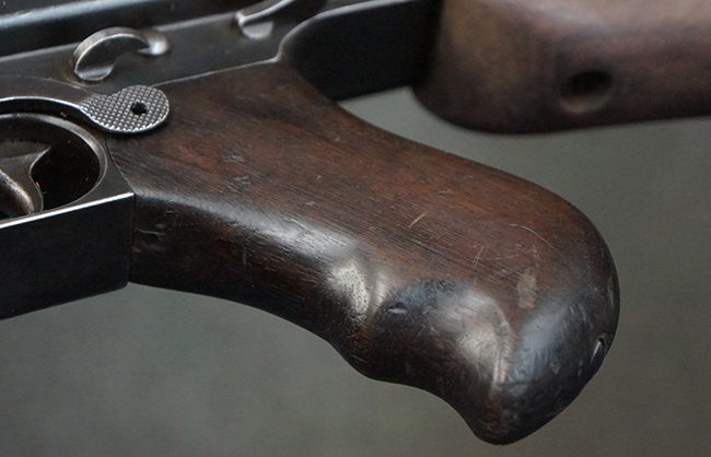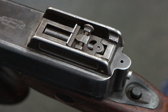 その後、トンプソンM1928A1短機関銃の製造コストを下げるために各部を改良したトンプソンM1短機関銃の他、さらに撃針の固定化等の追加改良を加えたM1A1といったモデルも製造されました。 M1A1ではリア・サイトの変形を防止する為、三角形のリア・サイト・ガードが標準装備されるようになりました。また、元々はM1として製造された物の中にも、後にM1A1に準じた改修を受けてA1刻印を追加された個体も存在します。