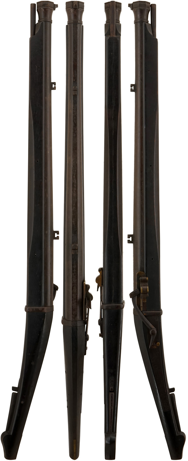 本品の筒(銃身)を含む鉄部は黒錆に覆われていますが、これは当時の日本における防錆方法であった錆付けによるもので、欧米のようにブルー仕上げがなかった日本では一般的なものでした。 銃身はやや朽ち込み痕等が見られるものの、大きな欠損等は見られず、しっかりとした状態が保たれています。 銃身下部の目釘金具と目釘穴の位置は三箇所とも一致しています。 尚、真鍮製の目釘が2本付属致しています。 樫材と思われる台 (銃床) は漆で黒っぽく仕上げられています。やや打ち傷や線傷、擦れが見られますが、古式銃として十分に許容範囲で美しい状態が保たれています。 鉄製のカラクリの地板金や胴金、ナマコ金など適度な時代錆が付いた良い雰囲気となっています。
