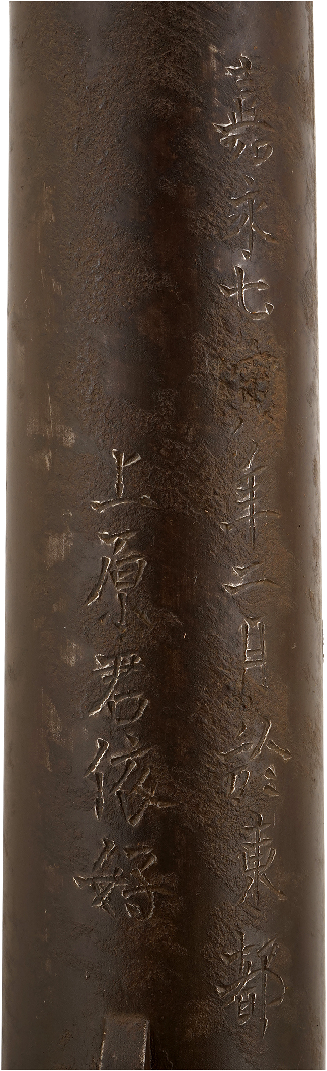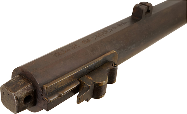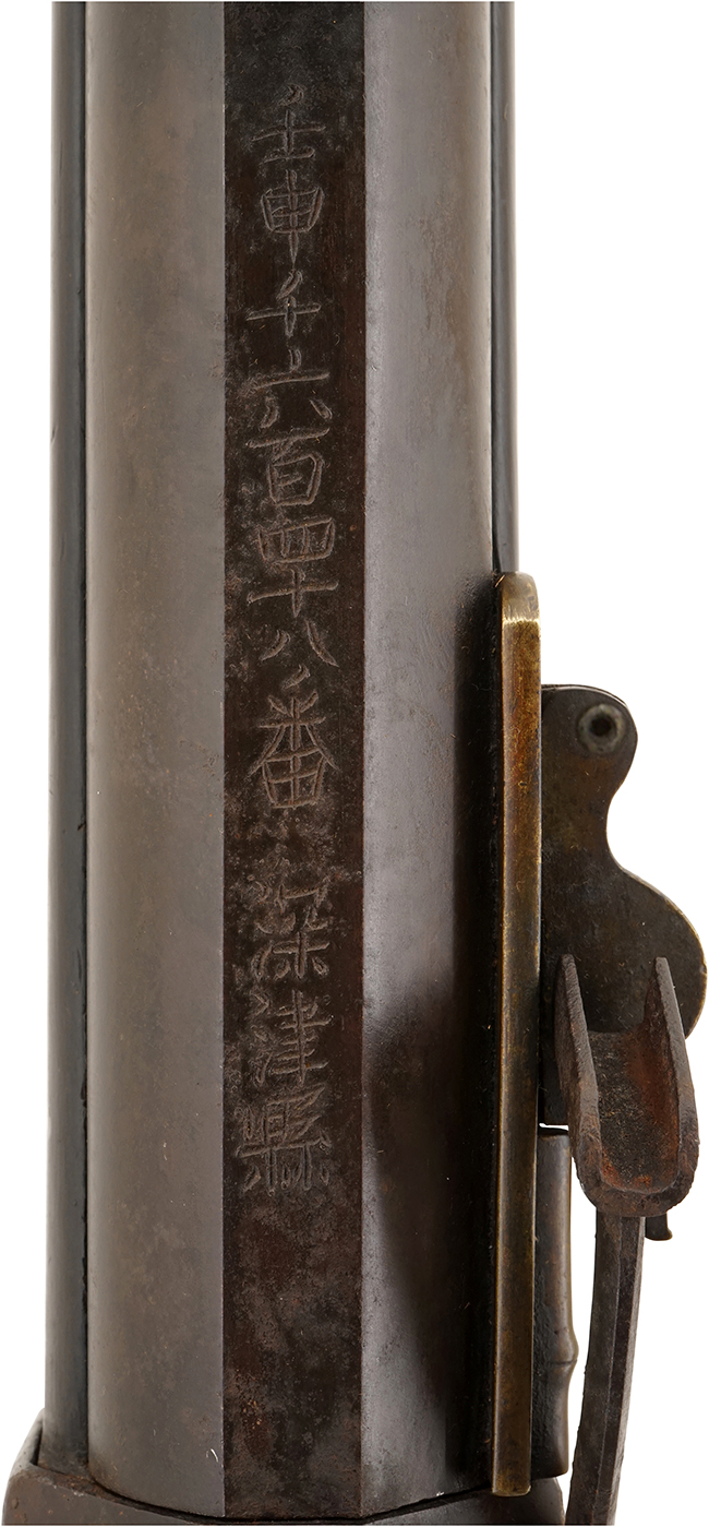本品は在銘品で、銃身下面には「上原君依好 嘉永七寅年二月於東都 江州住國友九左衛門純睦」の銘が入っています。 國友九左衛門(くにとも きゅうさえもん すみむつ[推測])は江州国友の鉄砲鍛冶の一門で全国鉄砲鍛冶銘鑑P.103に「嘉永二年」の年記入りがあることが記されています。 また全国鉄砲鍛冶銘地域別分類P.96に「江州の鉄砲鍛冶」として記載されており、「國友九左衛門家」は国友鉄砲鍛冶の名家で「純睦」の他に「孝政」「純晴」「重高」「重当」「統睦(純睦と同人?)」がいます。「嘉永二年(1849年)」年の現存品もある事から入り江戸時代後期(特に嘉永年間[,1848-54年])に活躍した国友鉄砲鍛冶と言えます。年記と応需銘は「上原君依好 嘉永七寅年二月於東都」とあり、の「東都」とは西の京都に対して、東の都を意味する江戸を指します。 「上原君の依頼によって嘉永七年(1854年)の寅年の二月に江戸に於いて作る」の意味になります。長銘に加えて年記と応需銘 が入った資料的価値の高い品です。 刀鍛治が他所で作刀する事に比べ、分業制の火縄銃製作において、国友の鉄砲鍛冶が江戸で作銃をする事は非常に珍しいです。また、堂々とした銘切りから真正品と言えます。