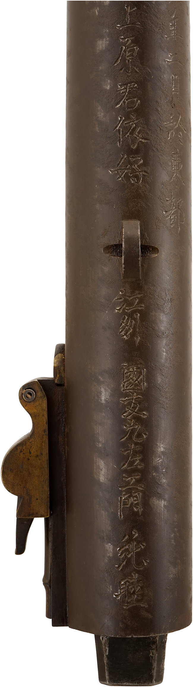 本品は口径が17.3mm、全長が106.0cm、銃身長が69.5cm、重量約◯◯ kgの中筒としてはほぼ平均的な火縄銃で、抱きかかえるようにして射撃をしたと思われます。 軍用の中筒は6匁筒 (15,8mm)~10匁筒 (18,7mm) 前後で、それ以上は大筒と呼ばれる事もあります。 大筒の定義は定かではありませんが、抱えて射撃の不可能な50匁筒 (33mm) 以上の品を大筒と呼ぶこともあるようです。本品は中筒の定寸口径とも言える十匁(18.3mm)に僅かに及ばない、 八匁(17.3mm)で す。全体的な形状から上野国(群馬県)の荻野六兵衛安重(1613―90年)が興した荻野流傍系でないかと思います。 高島秋帆が荻野流砲術を基に製作した十匁筒を、 天保10年(1839)5月に書き写した「高島所持荻野流拾匁筒之図」に載っている絵図に全体的な形状は似てはいますが、輪束穴はありませんので名称を「荻野流傍系八匁中筒」としました。 山陽地方の中筒でよく見る形状です。 山陽地方の中筒は地元備前鍛治より国友や堺の鉄砲鍛冶の作品が多く、「千切り透かし」の中目当が付いているのも特徴で、本品は国友の在銘品です。
