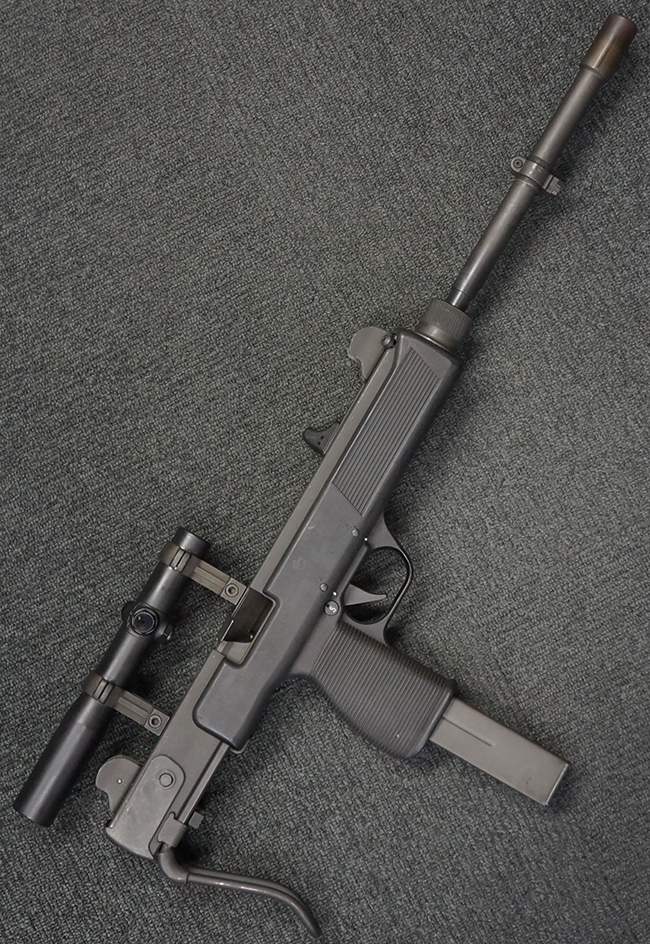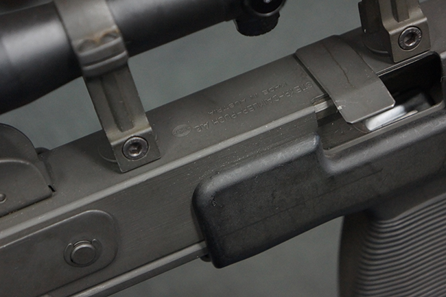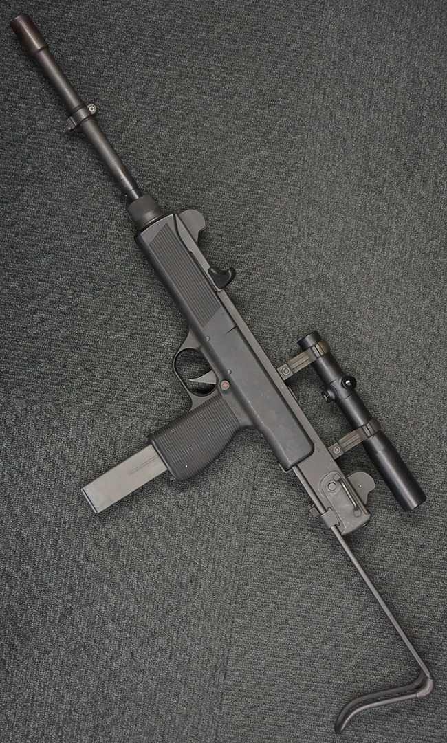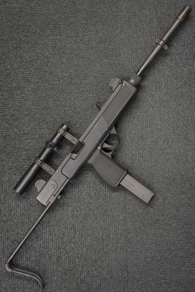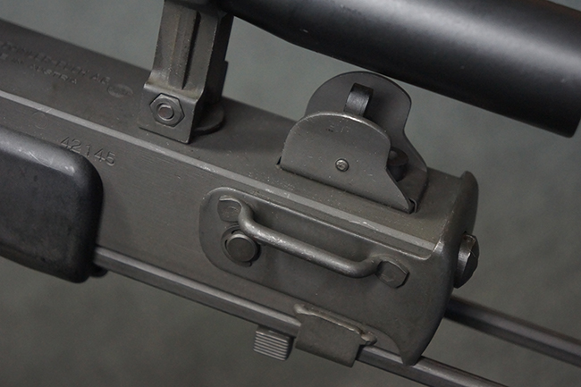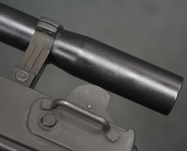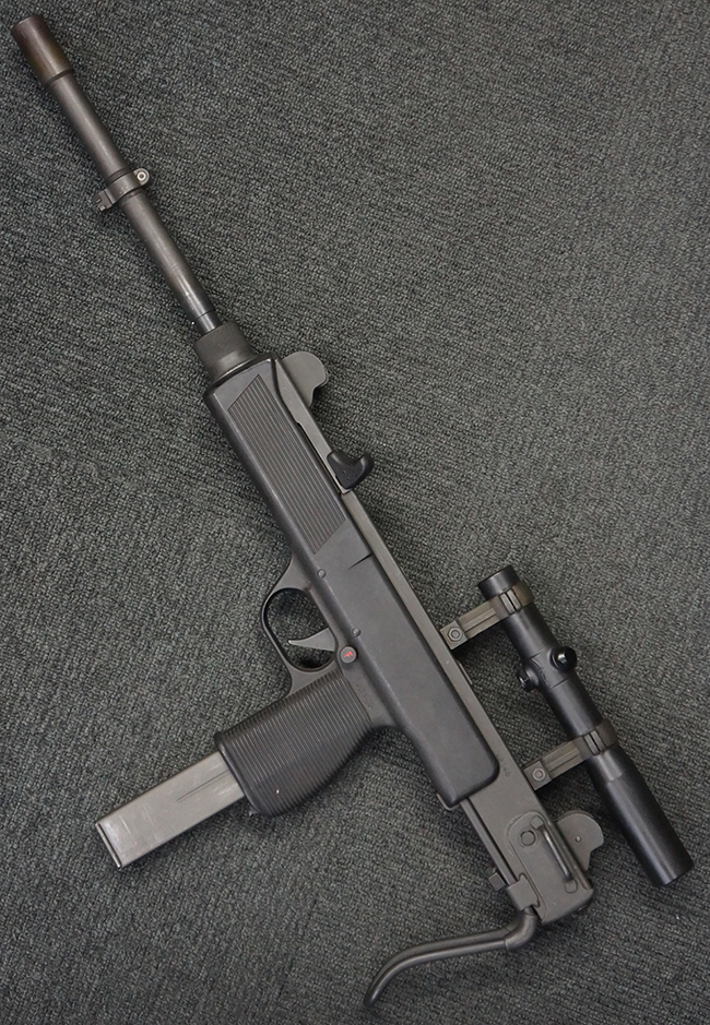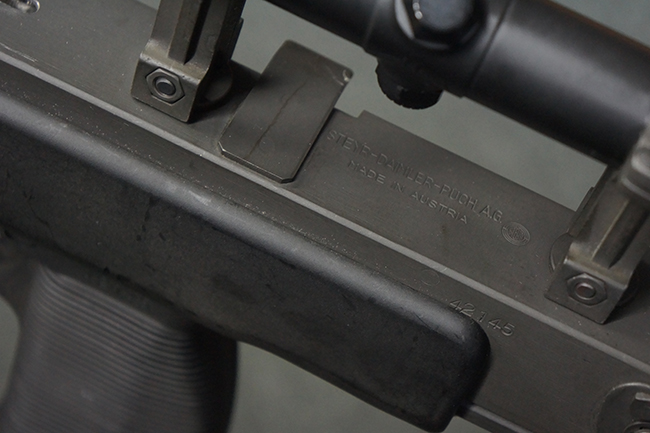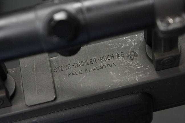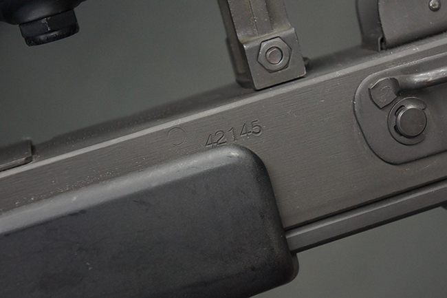 本品はロング・バレルに着剣装置、スコープ、排莢口上部にケース・ディフレクターが装備された、ガンポート仕様の珍しいタイプのステアー MPi81 短機関銃です。 レシーバー上面には「STEYR-DAIMLER-PUCH A.G. MADE IN AUSTRIA」のメーカー刻印及びステアー社のロゴが入っています。 シリアルNo.はアッパー・レシーバーとロア・レシーバーでマッチしています。