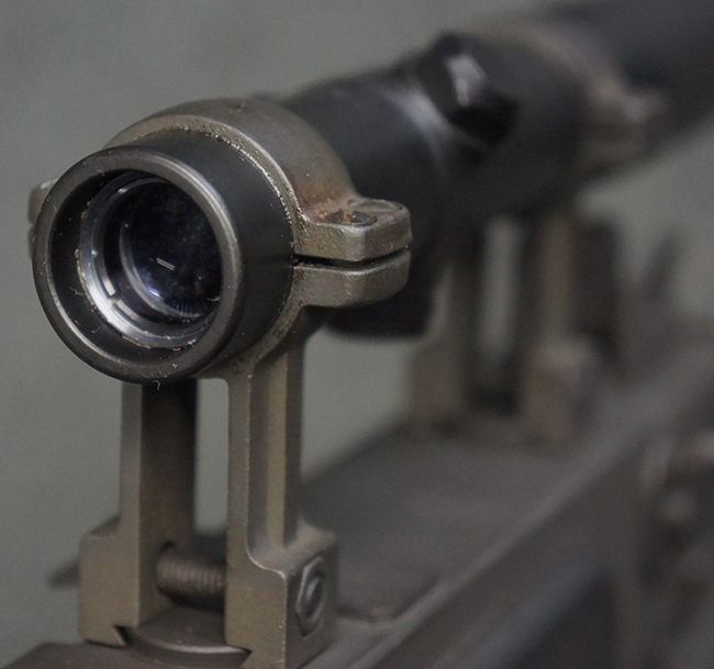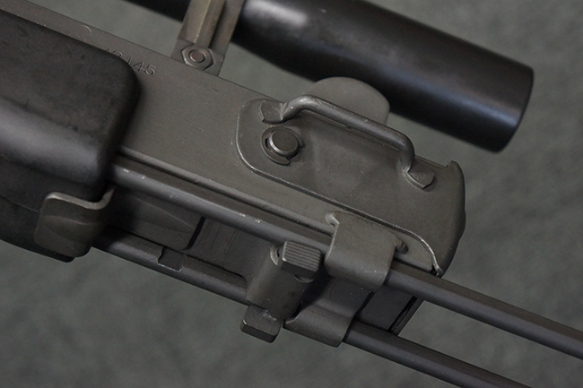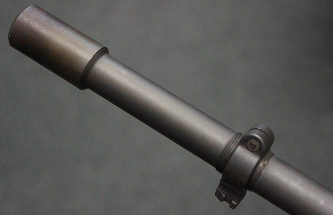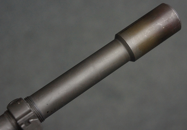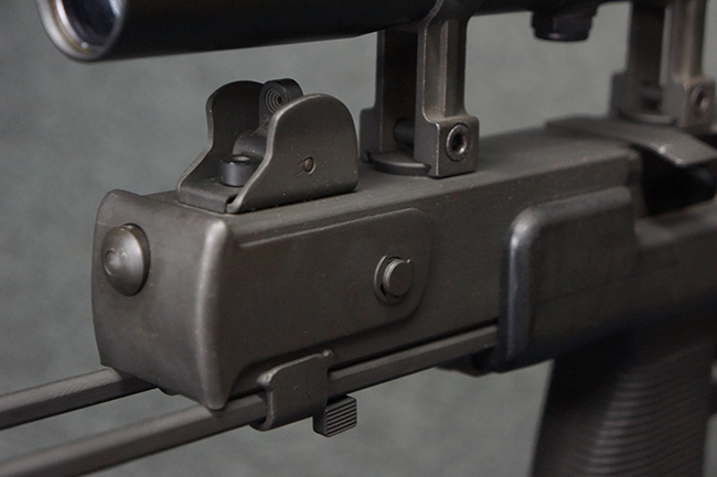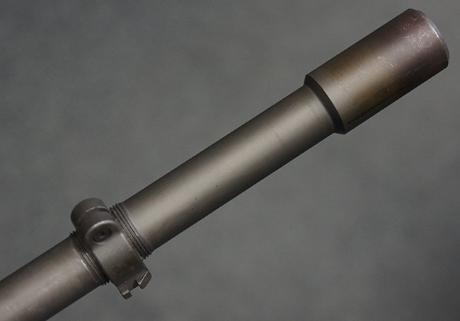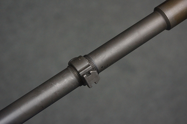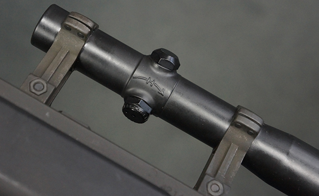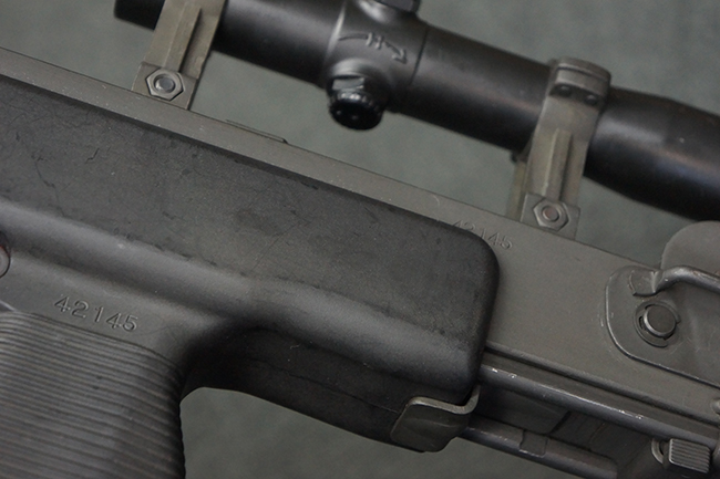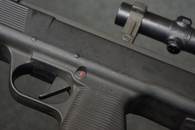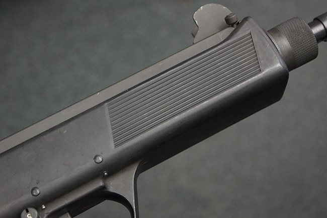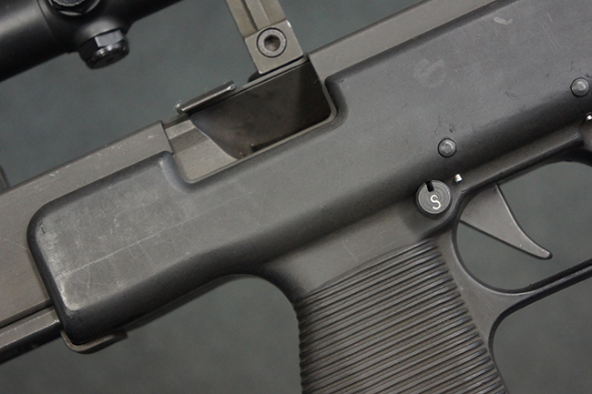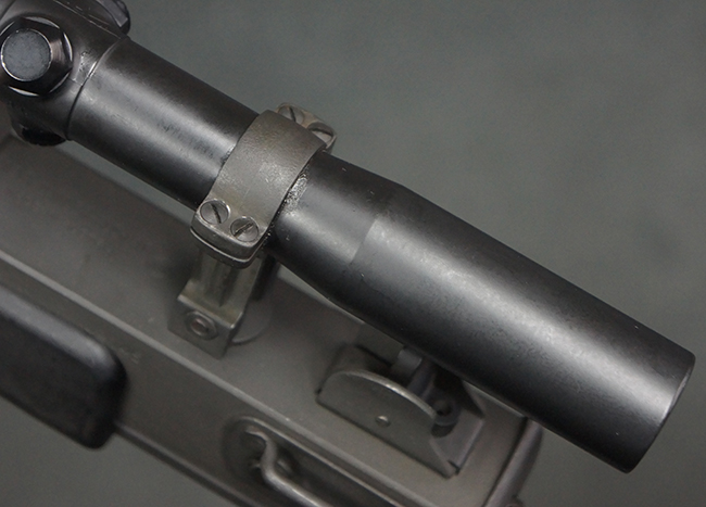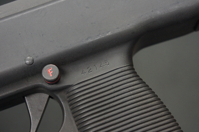 本品はロング・バレルに着剣装置、スコープ、排莢口上部にケース・ディフレクターが装備された、ガンポート仕様の珍しいタイプのステアー MPi81 短機関銃です。 レシーバー上面には「STEYR-DAIMLER-PUCH A.G. MADE IN AUSTRIA」のメーカー刻印及びステアー社のロゴが入っています。 シリアルNo.はアッパー・レシーバーとロア・レシーバーでマッチしています。