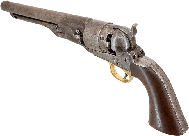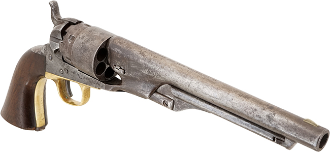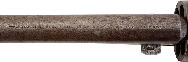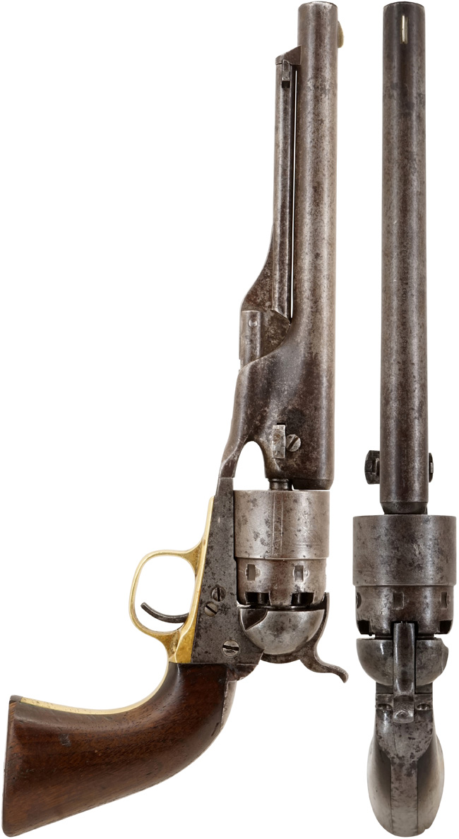 コルト社のパーカッション・リボルバーの特徴として銃身部分とフレーム部分がシリンダーを挟むように、前後に分解出来る構造になっています。 バレル・ウェッジと呼ばれる「楔」のような小さな部品を右から左に押し出す事によって、銃身部分とフレーム部分が容易に分離します。 シリンダーには1843年のカンペチェ海戦 (Naval Battle of Campeche) でテキサス海軍がメキシコ海軍を破る場面がエングレービングされています。 蛇足になりますが「M1860 Army Revolver」のモデル名は20世紀になってからコレクターが便宜上付けた名称で、発売当初のコルト社カタログでは「Colt Holster Pistol, Enlarged Caliber」となっています。 尚、「M1851 Navy Revolver」は「Colt Revolving Belt Pistol of Naval Caliber」です。(MM)