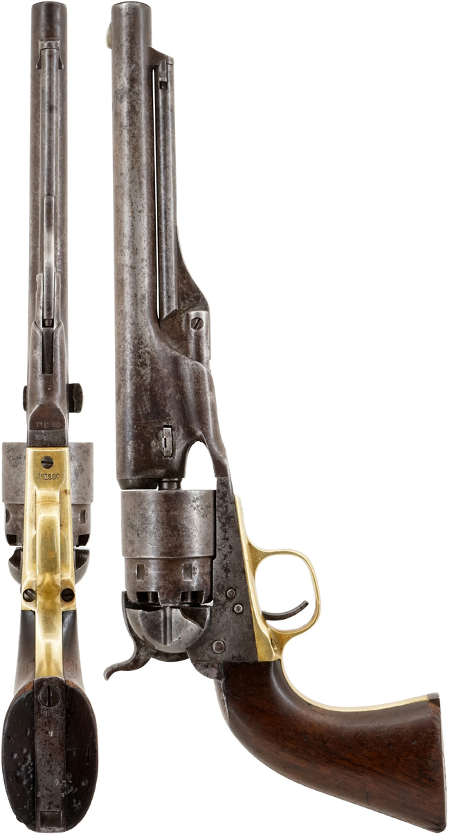 本品はM1860の中でもフレーム側面にショルダー・ストック取り付け用スクリューの無い、3 Screw Modelと呼ばれるシビリアン・モデルです。 本品はシリアルNo.131389 から1863年製である事が判ります。 南北戦争 (1861年-1865年) の真っ最中に製造された品で、シビリアン・モデルですが南北戦争で使用された可能性が非常に高い品です。 尚、通常シビリアン・モデルでは上記のスクリューの他、ショルダー・ストック基部が嵌るリコイル・シールド部の切り欠きや、ストックを固定する為のグリップ・フレーム下部の溝が省略されていますが、本品にはこれらの切り欠きや溝は残されています。 本品のシリアルNo.は、銃身、フレーム、トリガー・ガード、バック・ストラップ、シリンダー、シリンダー軸が(13)1389でマッチしています。 尚、バレル・ウェッジのシリアルNo.は9611となっています。